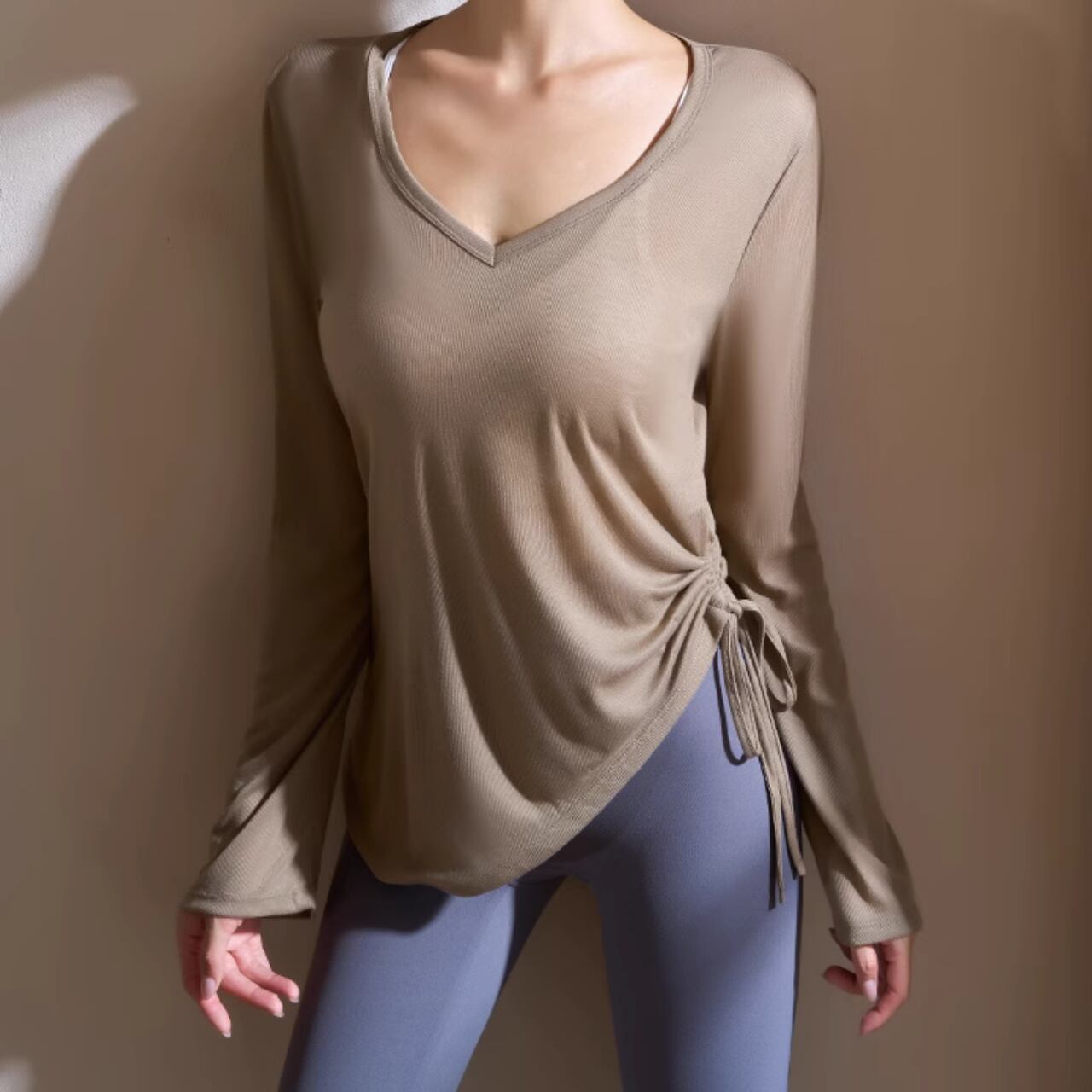 ゆったりとしたVネックと、片側に寄せたギャザーデザインがこなれた抜け感を演出し、