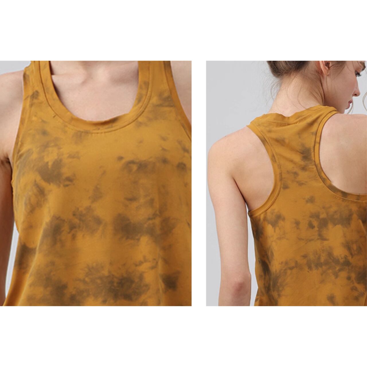 落ち着いたアースカラーのタイダイ柄と、動きやすいレーサーバックデザインが特徴のアクティブタンク。