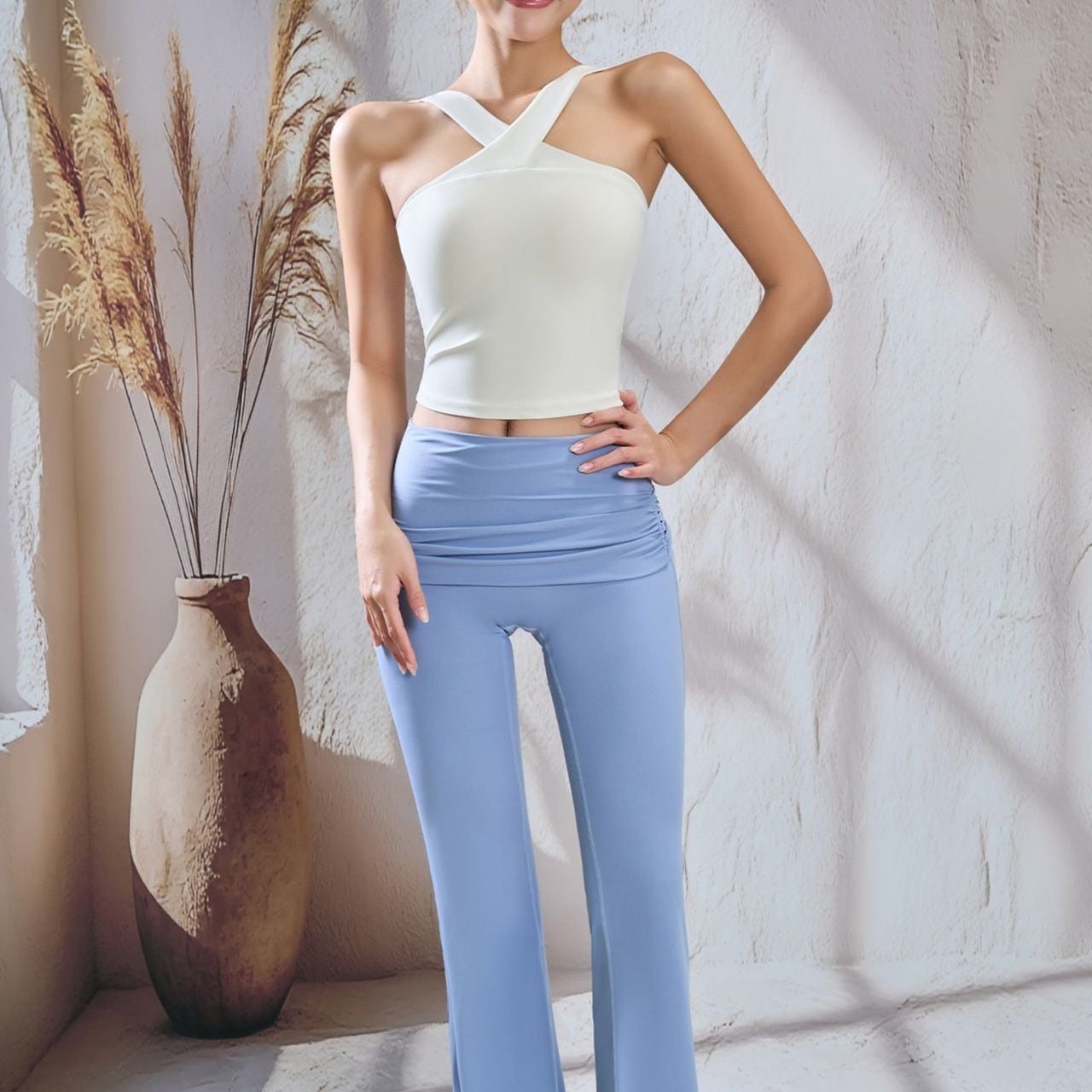 肩をすっきり見せるクロスデザインが、動きを美しく魅せる一枚。