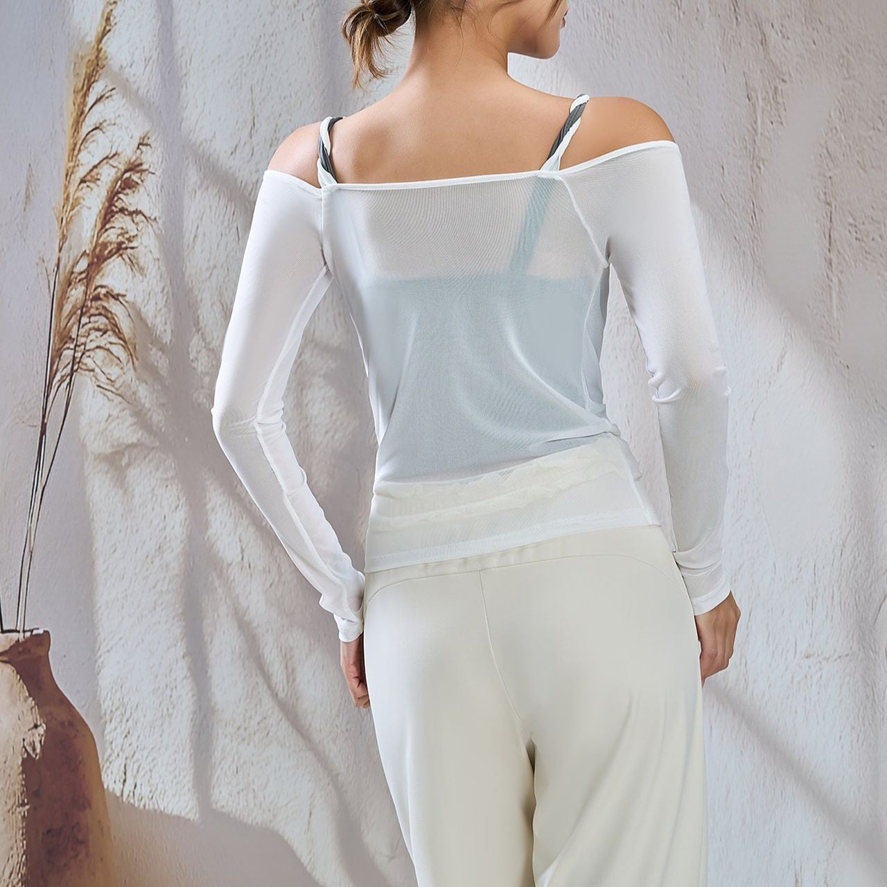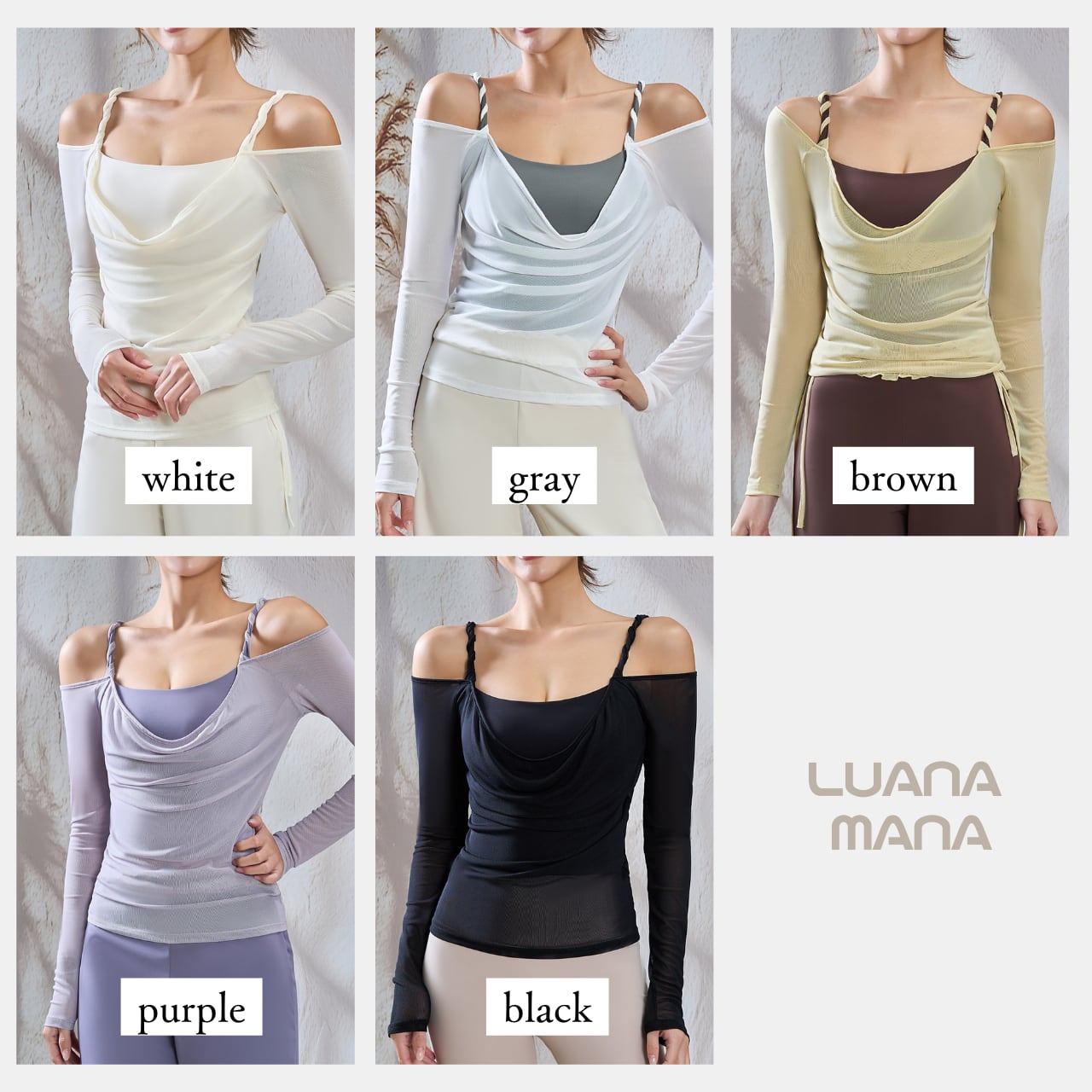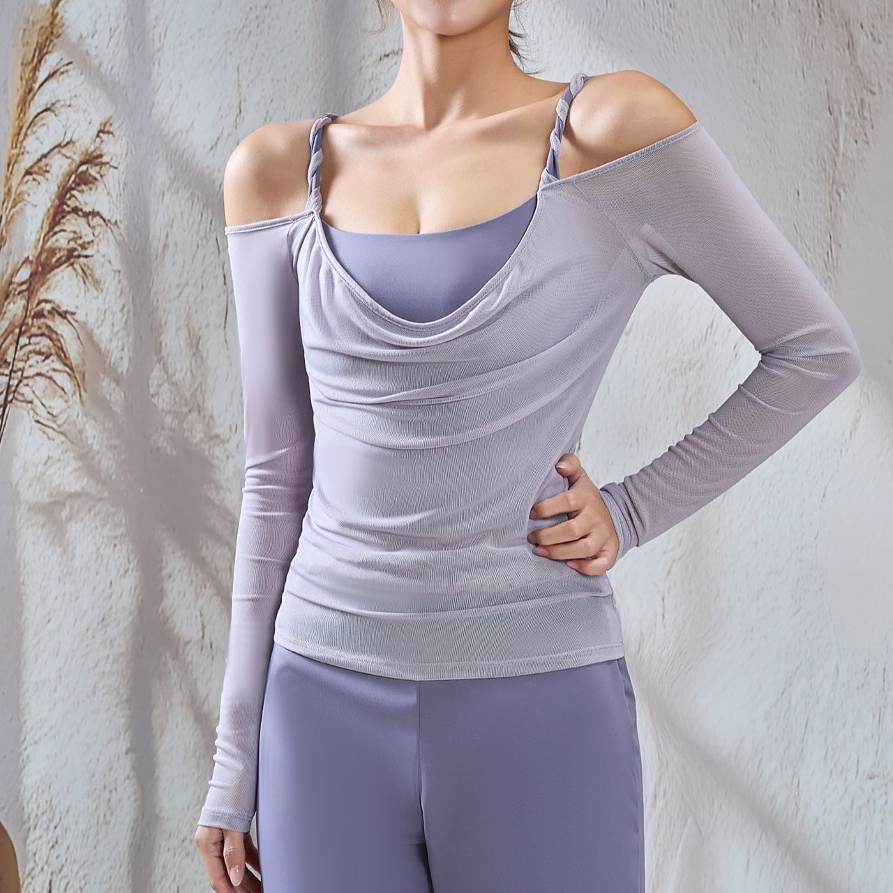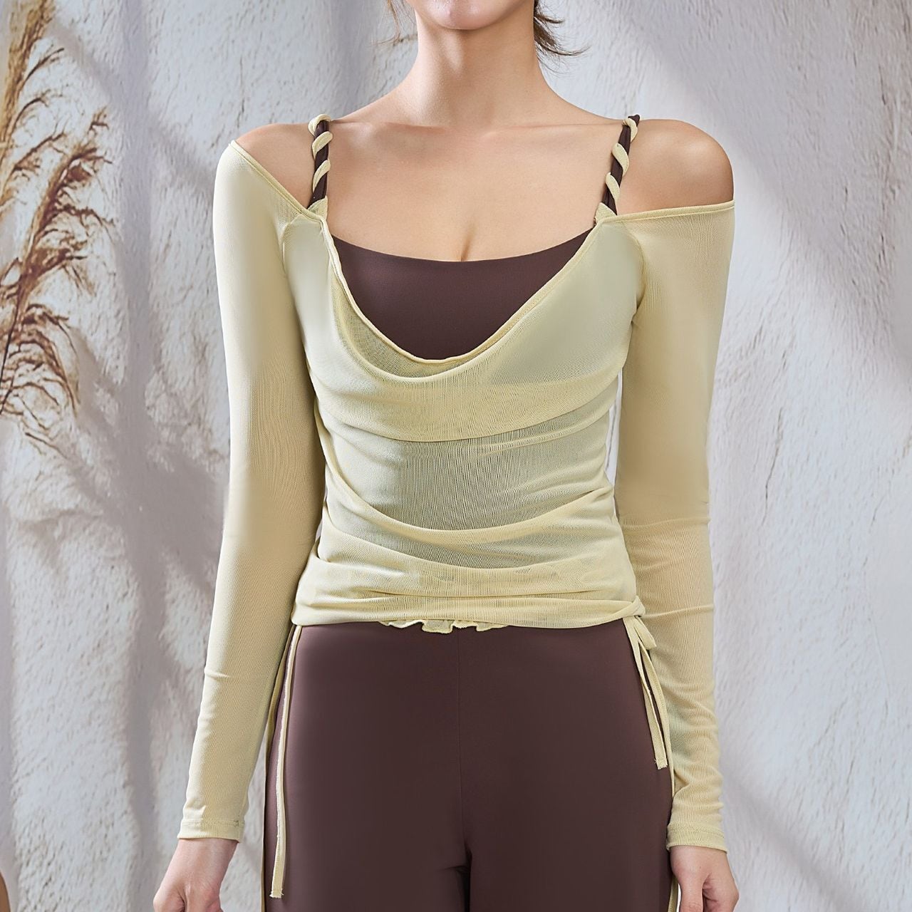 うっすら透けるメッシュ素材が女性らしい、ドレープデザインのカシュクールトップ。