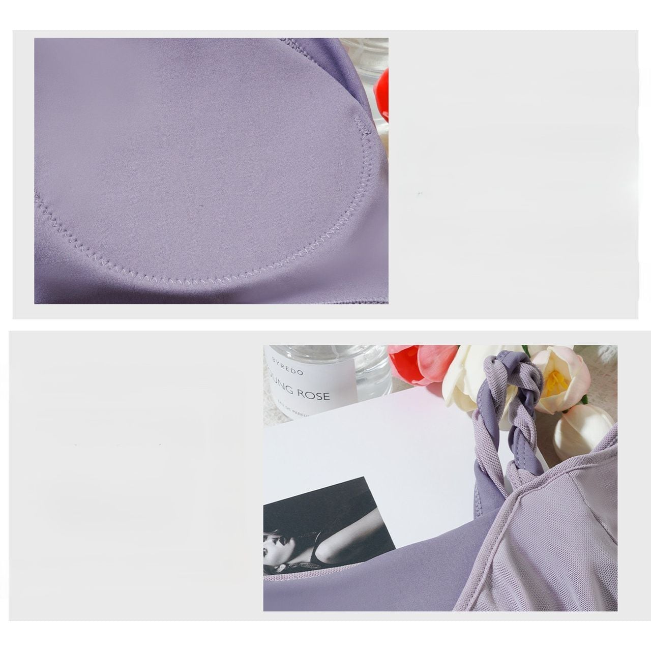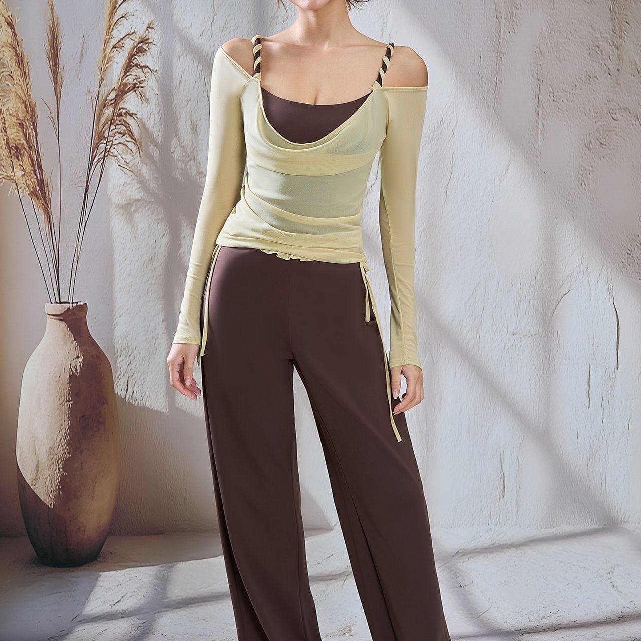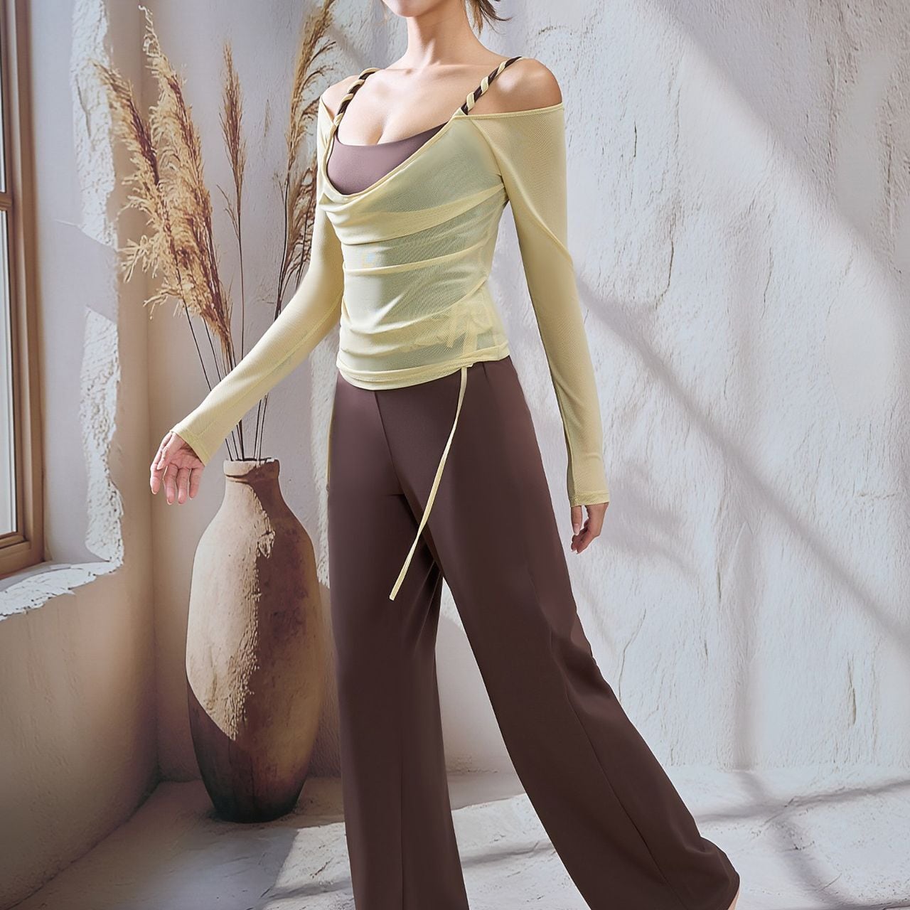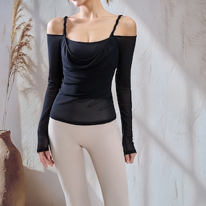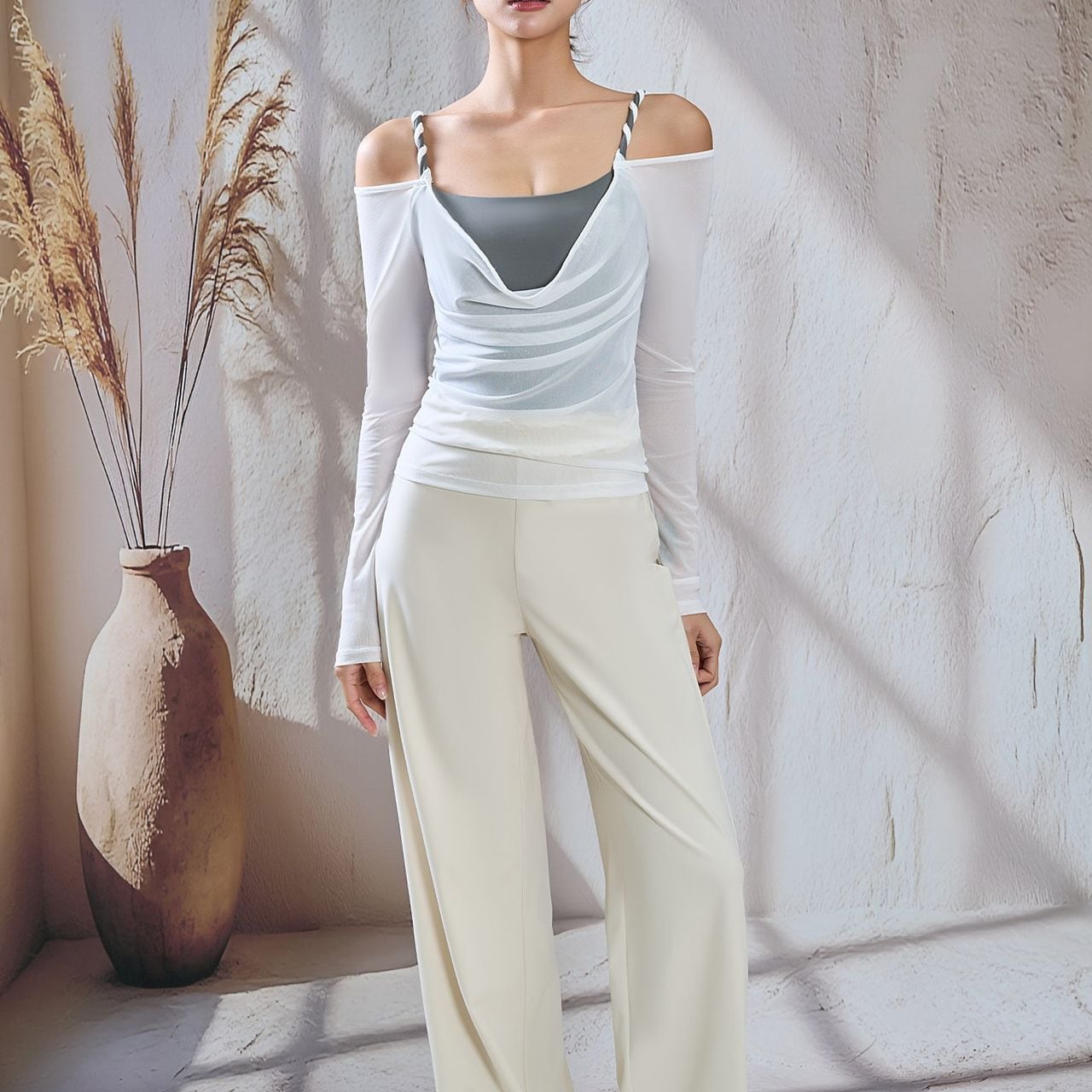 うっすら透けるメッシュ素材が女性らしい、ドレープデザインのカシュクールトップ。