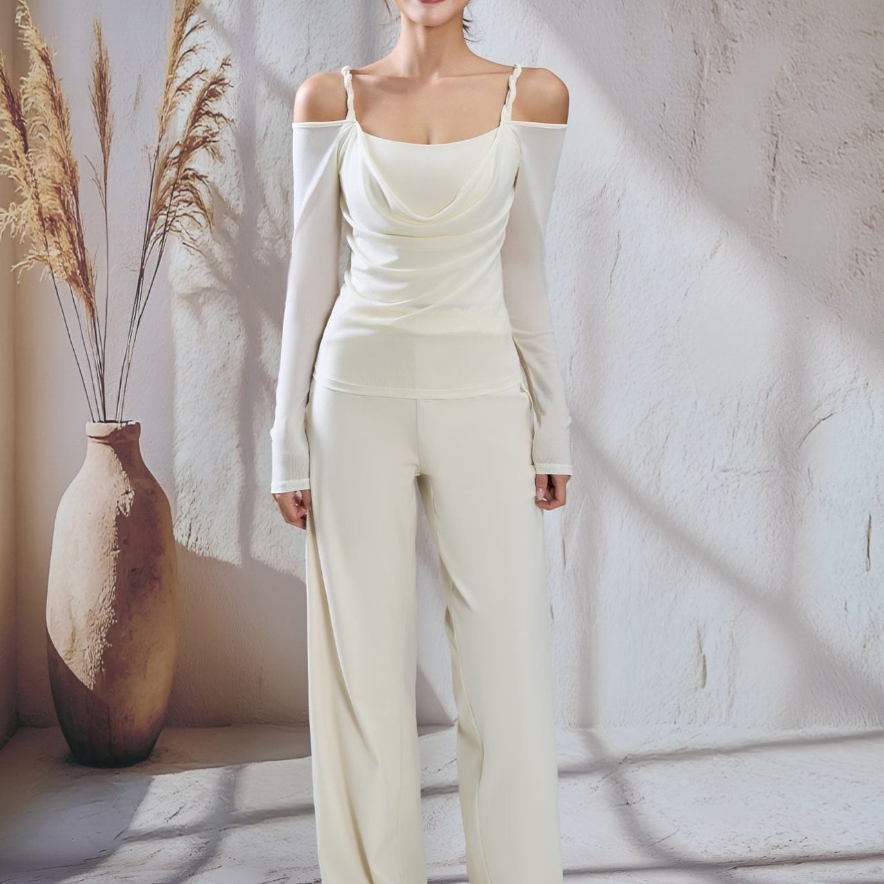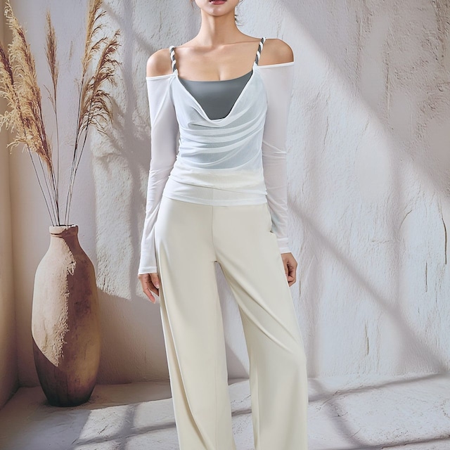 肩のストラップと長袖のギャップが絶妙で、インナーを見せるレイヤードも◎
