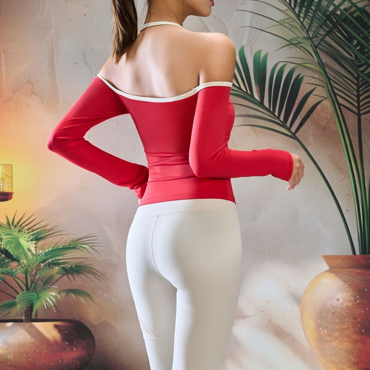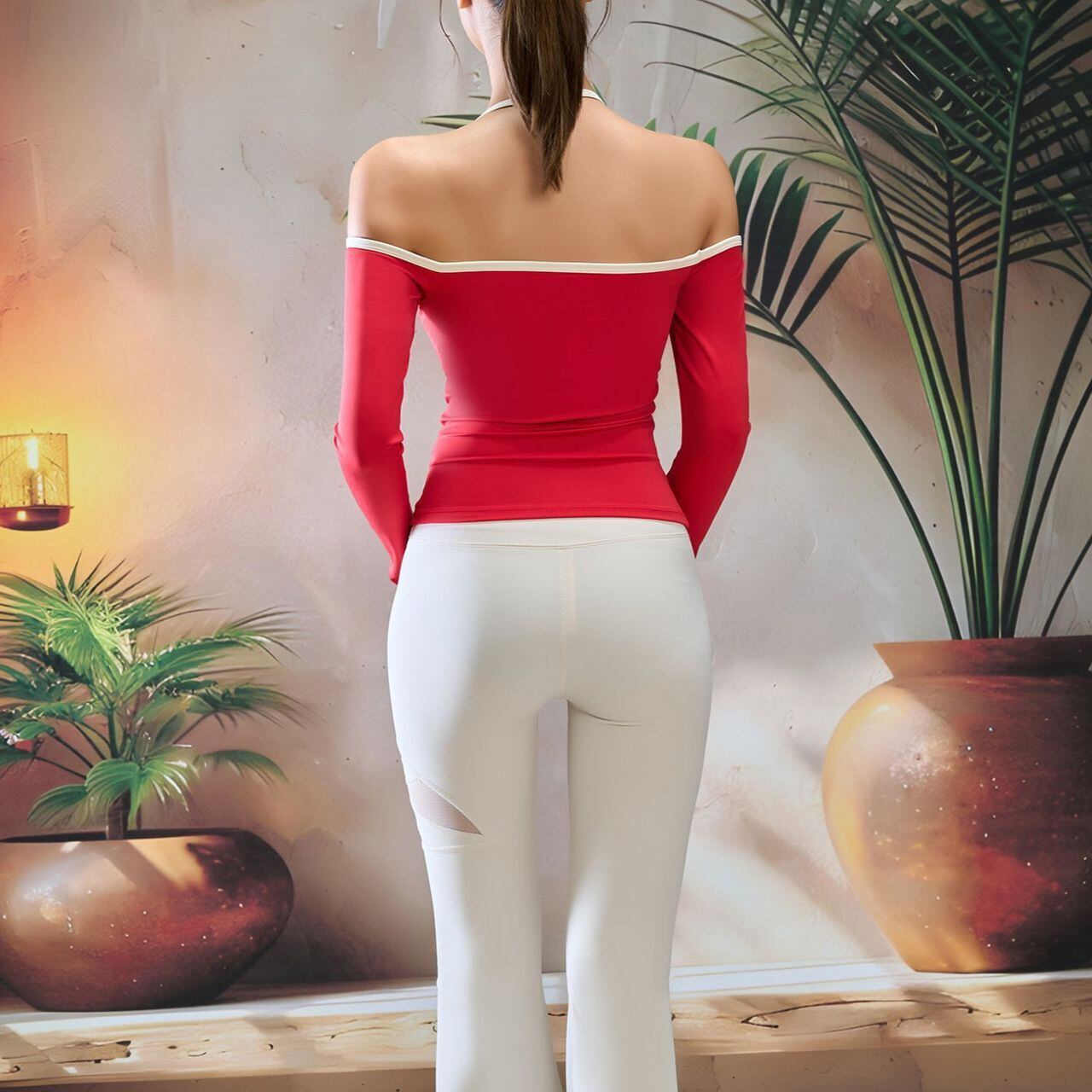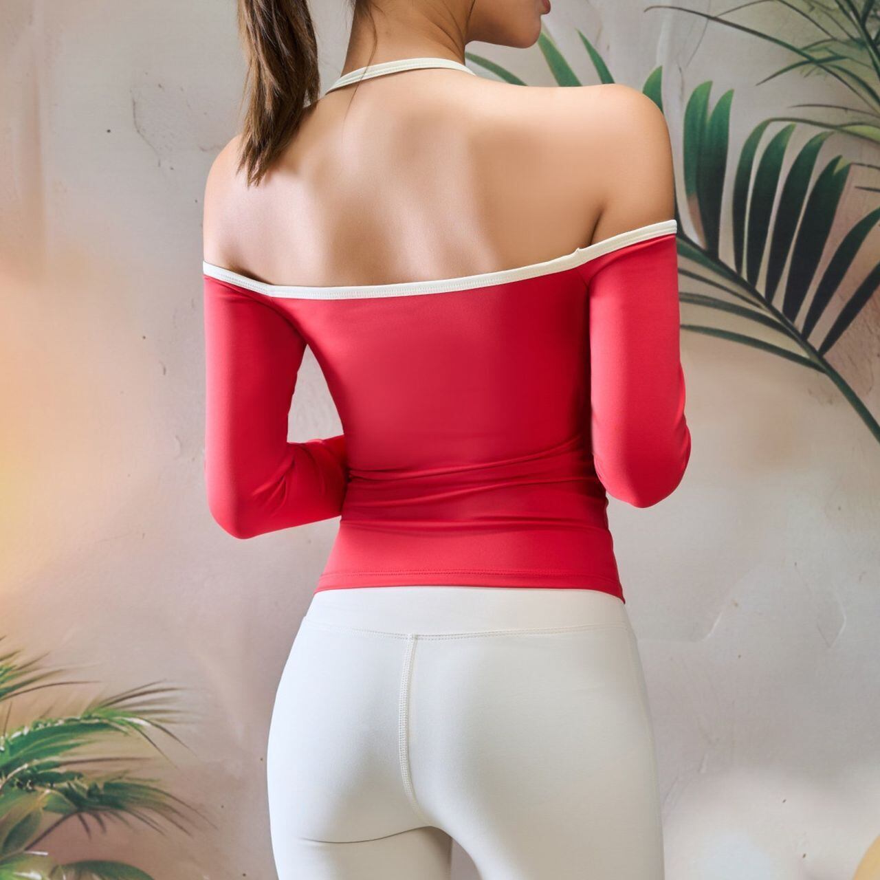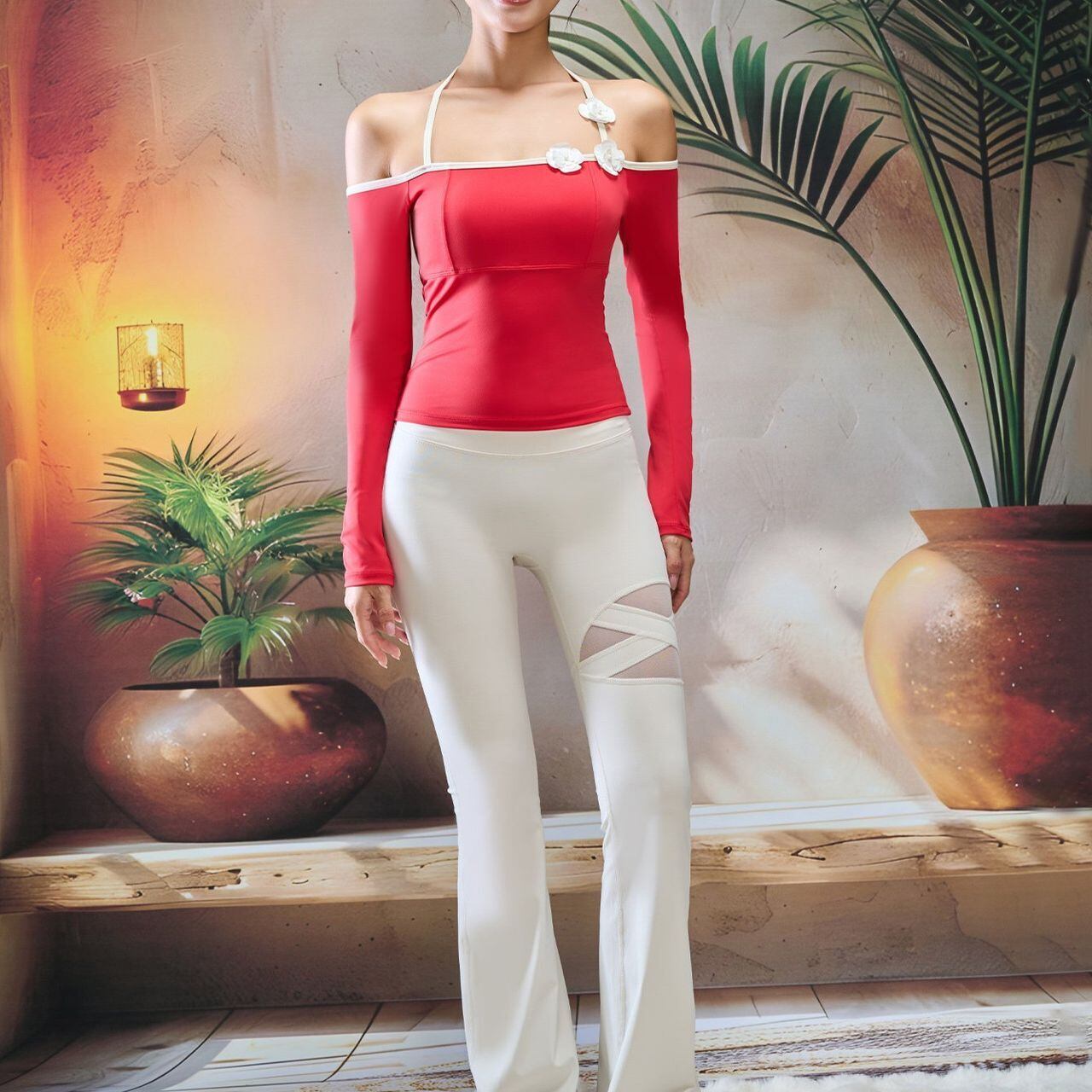 オフショルダーとホルターネックが絶妙なバランスで、女性らしさを引き立てながらも動きやすさも確保。