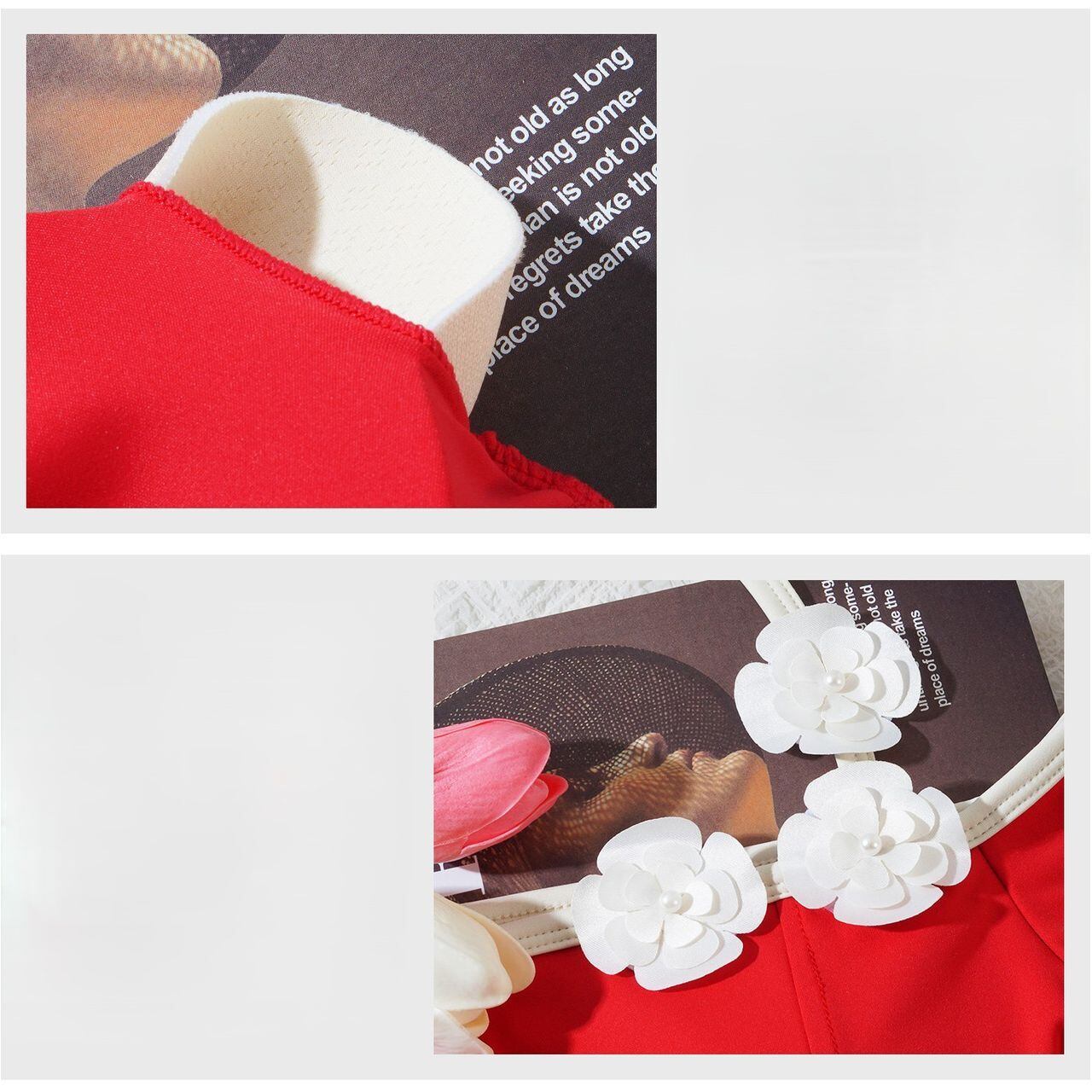 華やかな赤に立体フラワーモチーフが映えるデザイン。