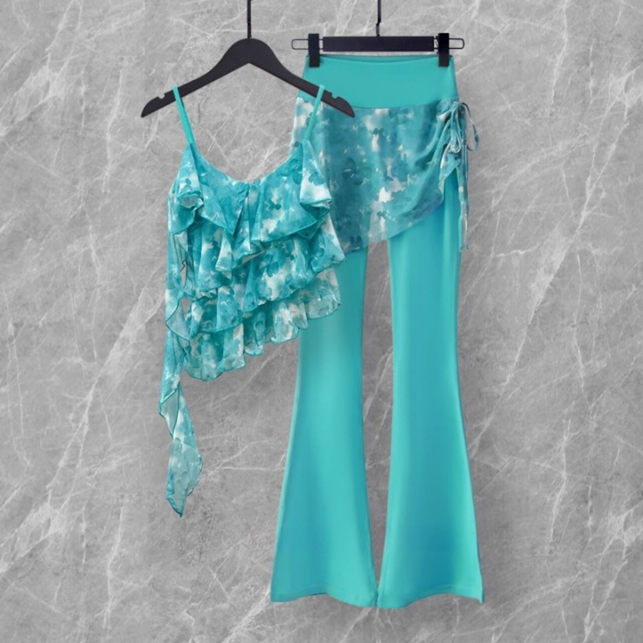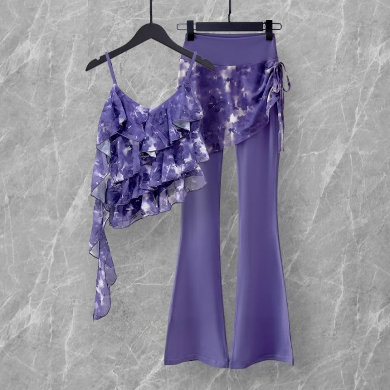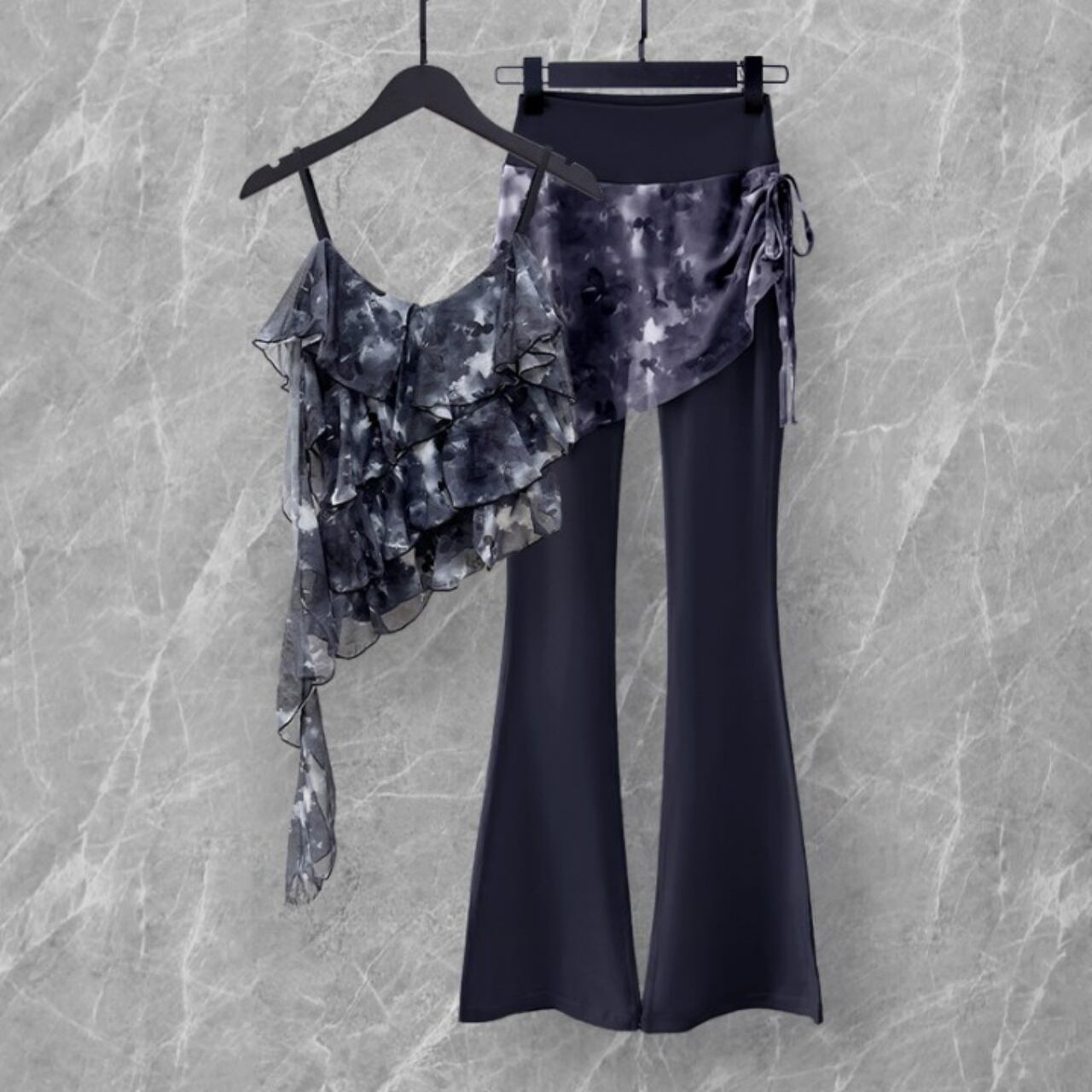 アシンメトリーなティアードトップスと、巻きスカート風デザインがセットになった1着。