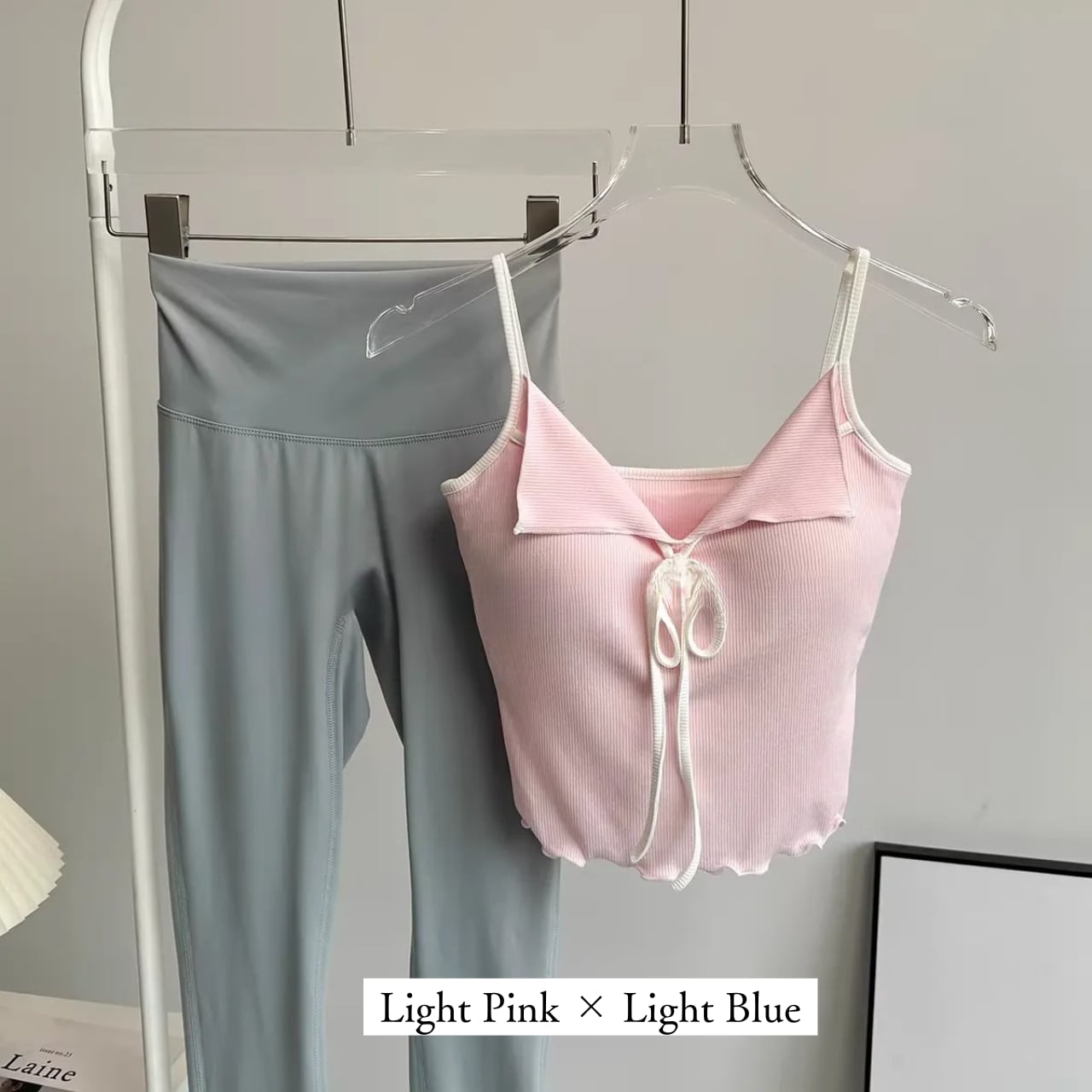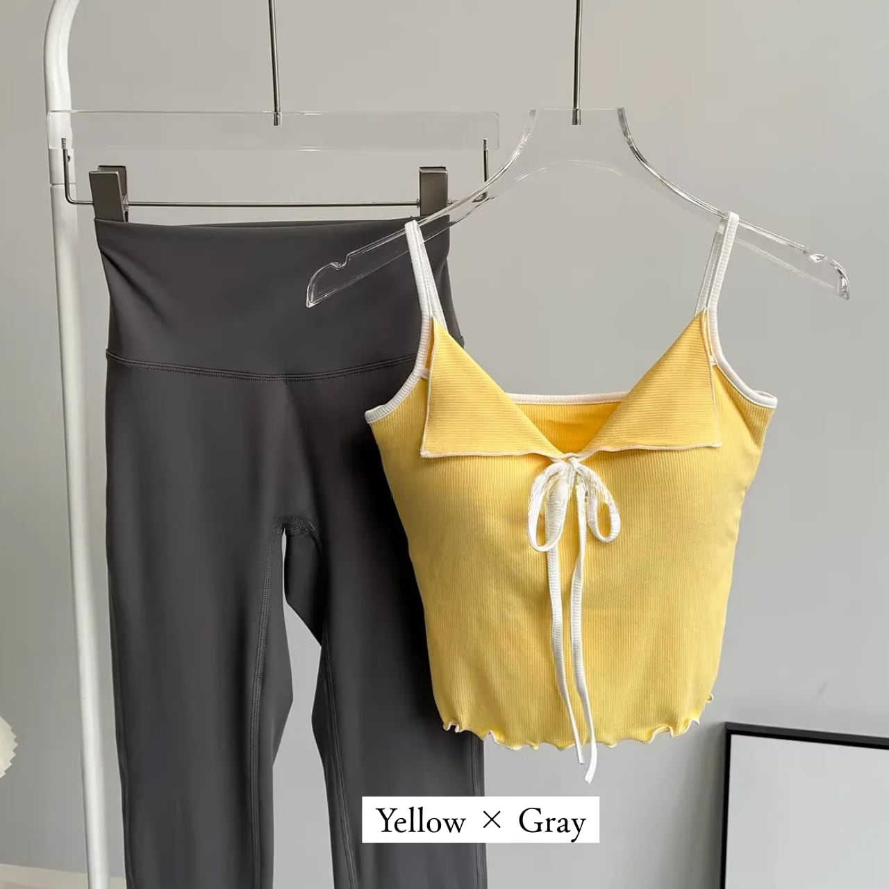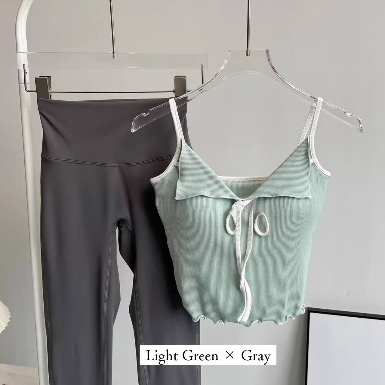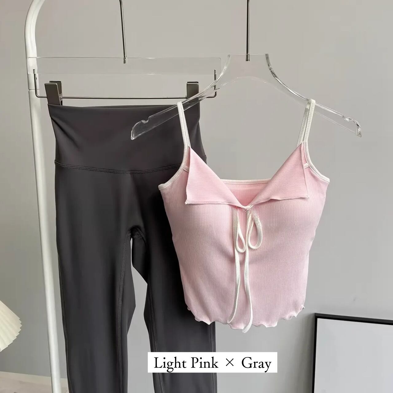 リブ素材のピンクキャミにフロントリボンをあしらったフェミニンなトップスと、シンプルなチャコールレギンスのセット。