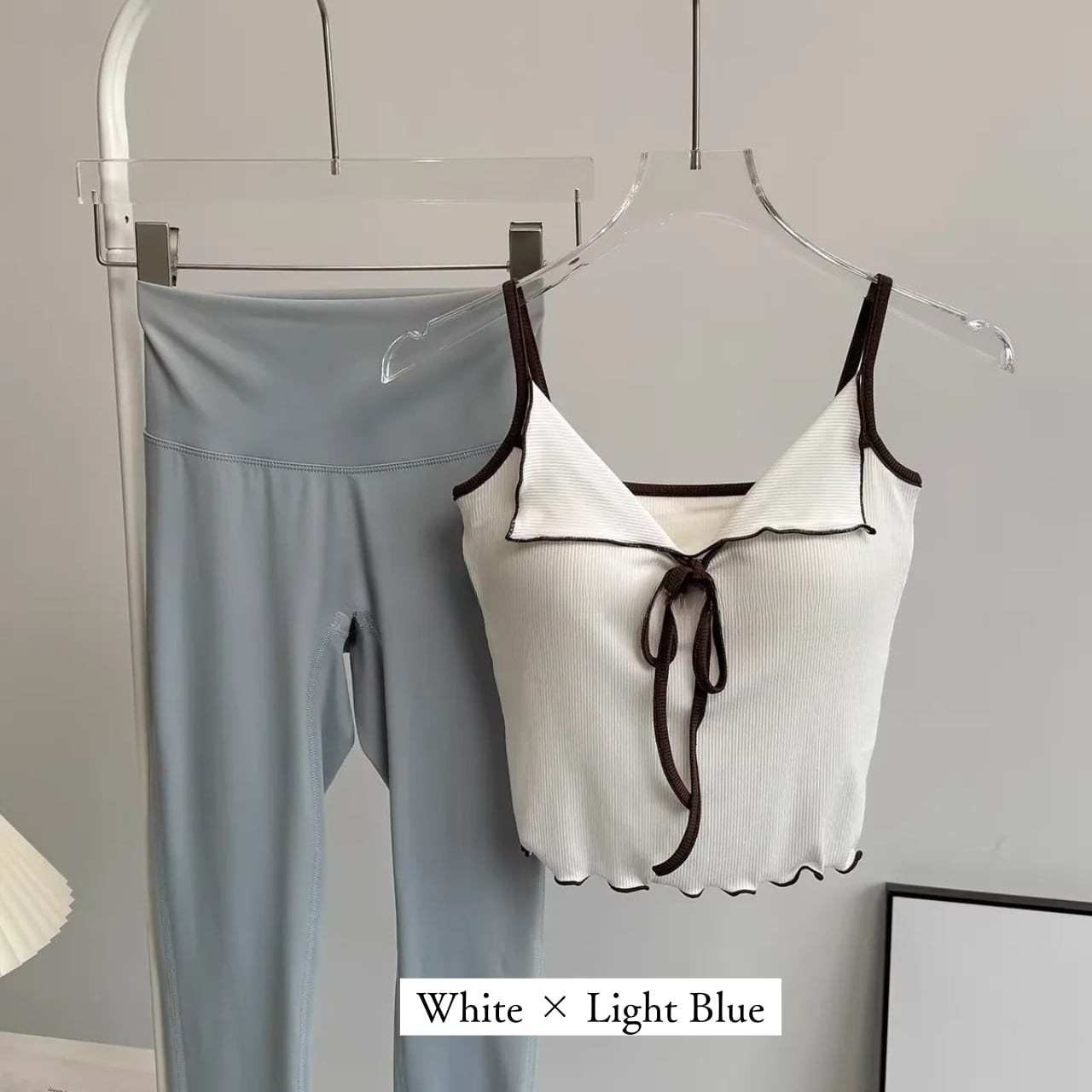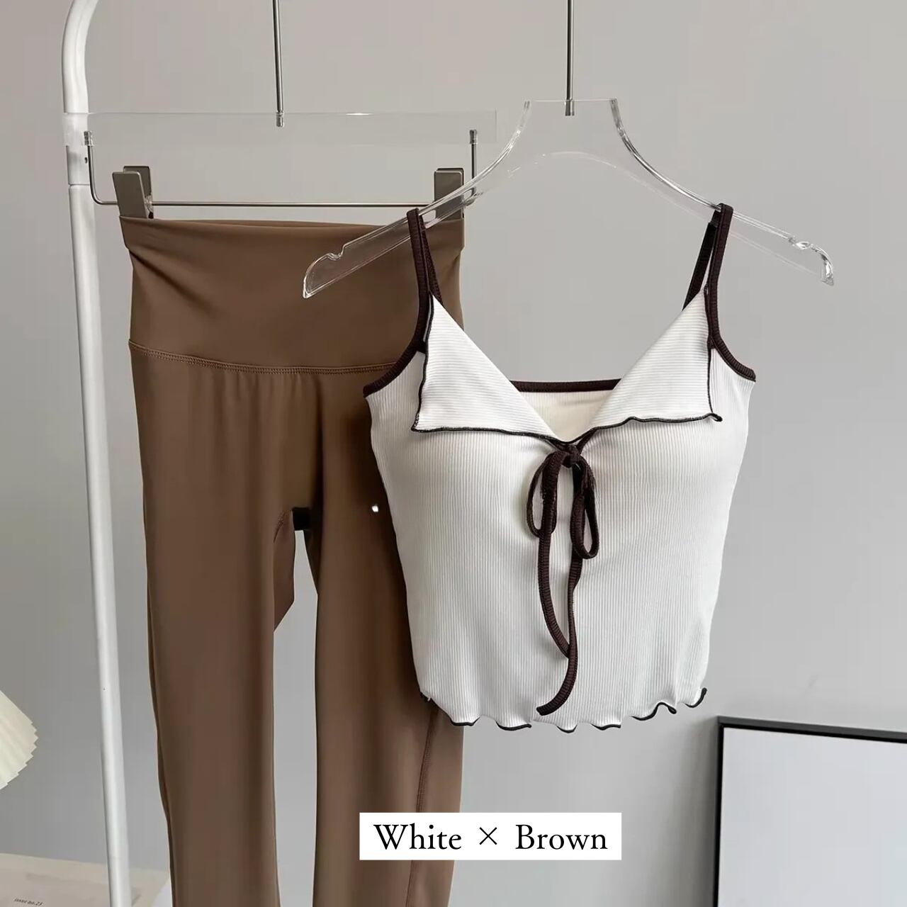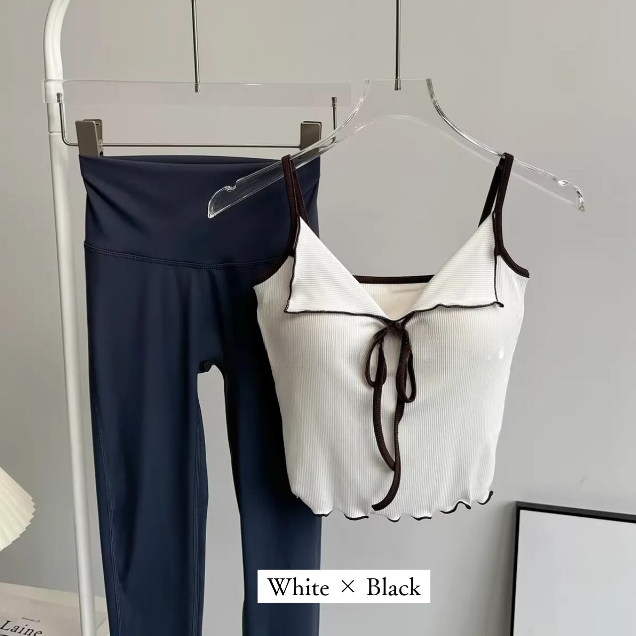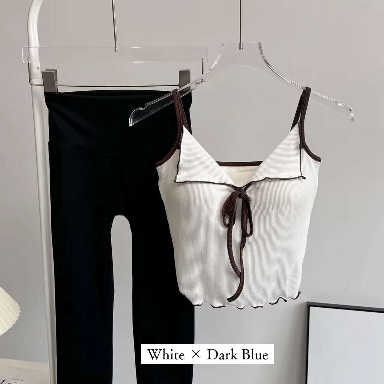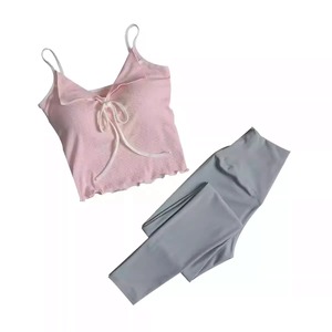 リブ素材のピンクキャミにフロントリボンをあしらったフェミニンなトップスと、シンプルなチャコールレギンスのセット。