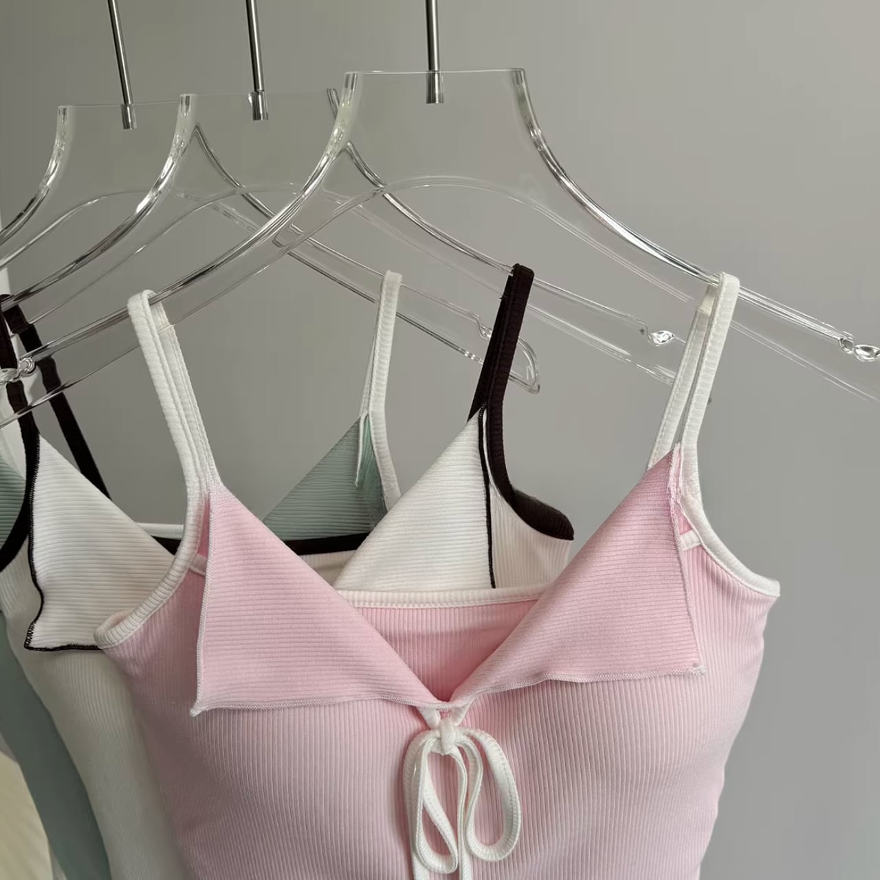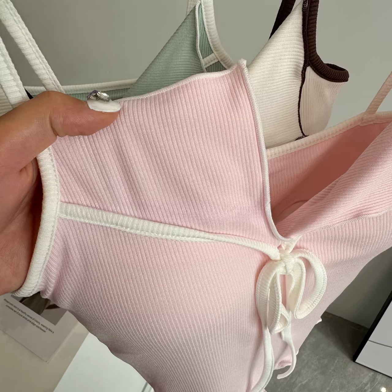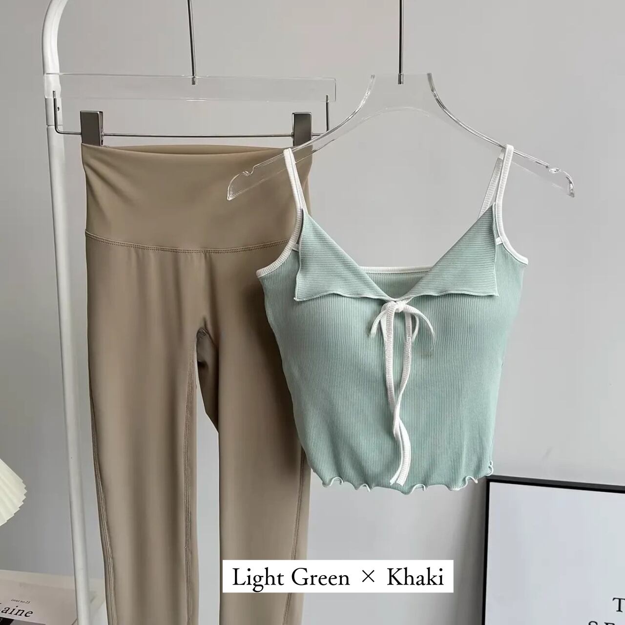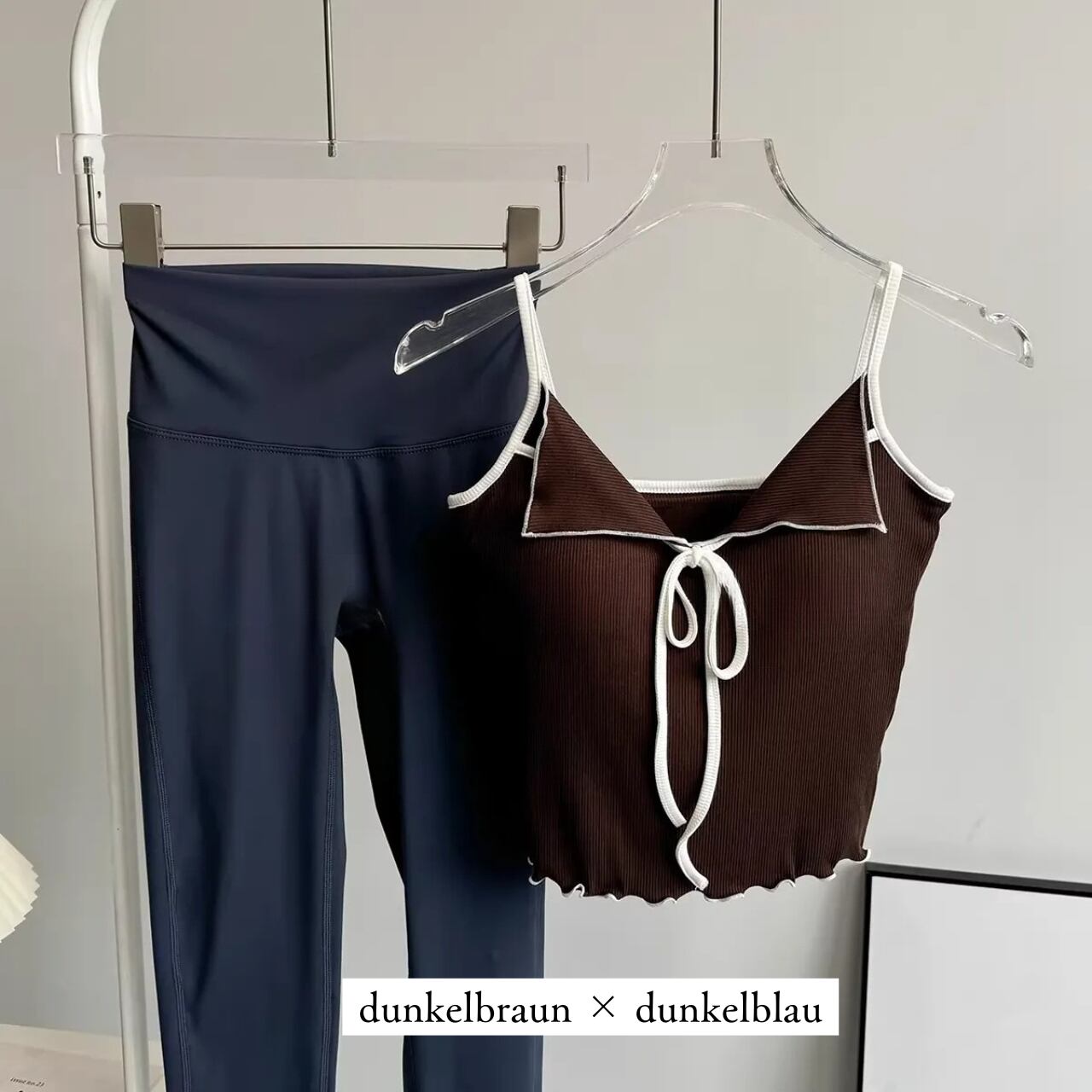 リブ素材のピンクキャミにフロントリボンをあしらったフェミニンなトップスと、シンプルなチャコールレギンスのセット。