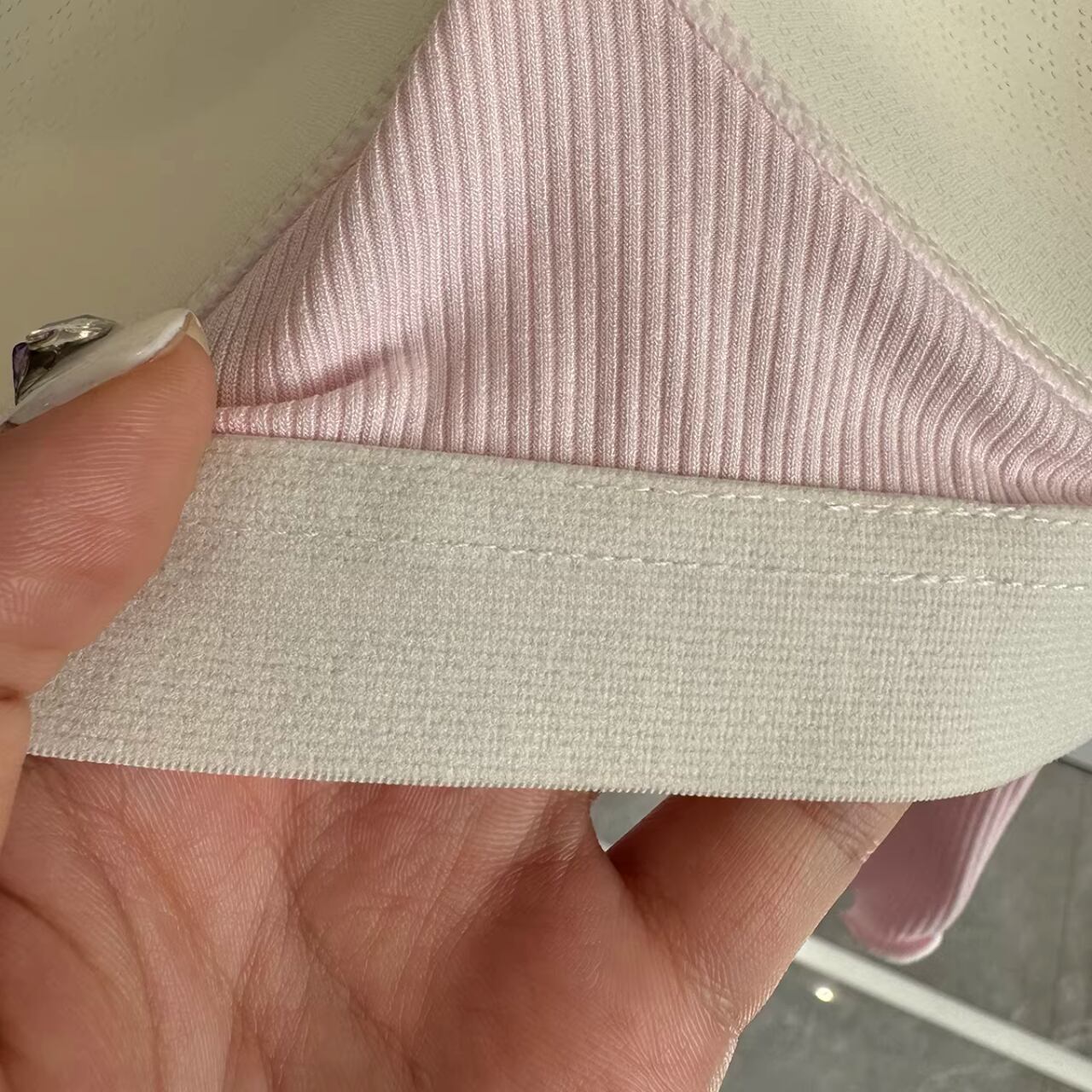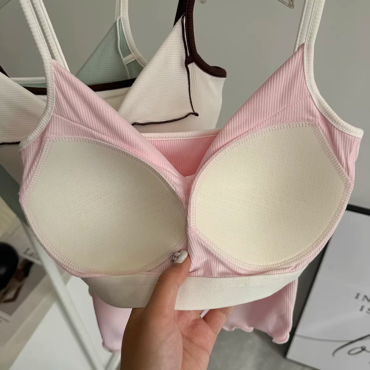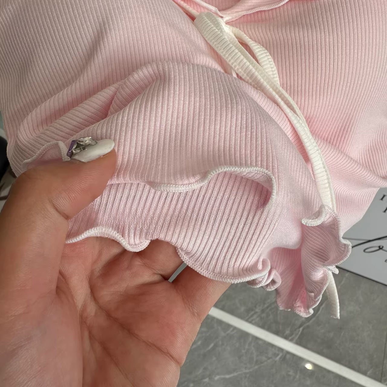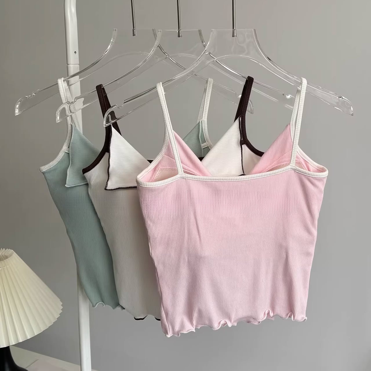 リブ素材のピンクキャミにフロントリボンをあしらったフェミニンなトップスと、シンプルなチャコールレギンスのセット。