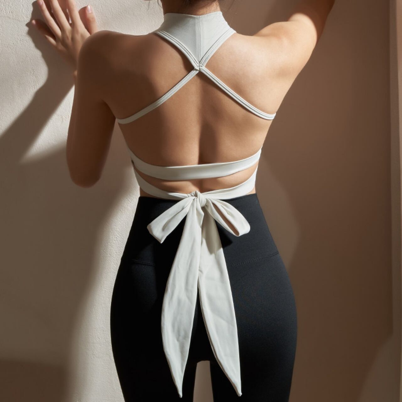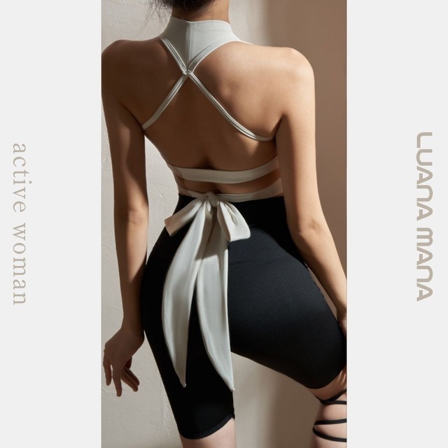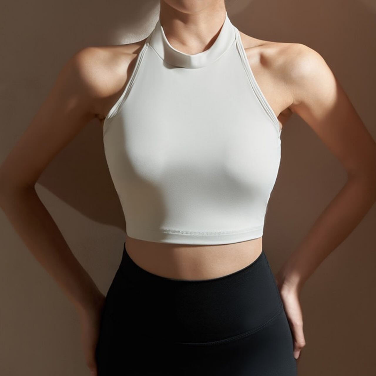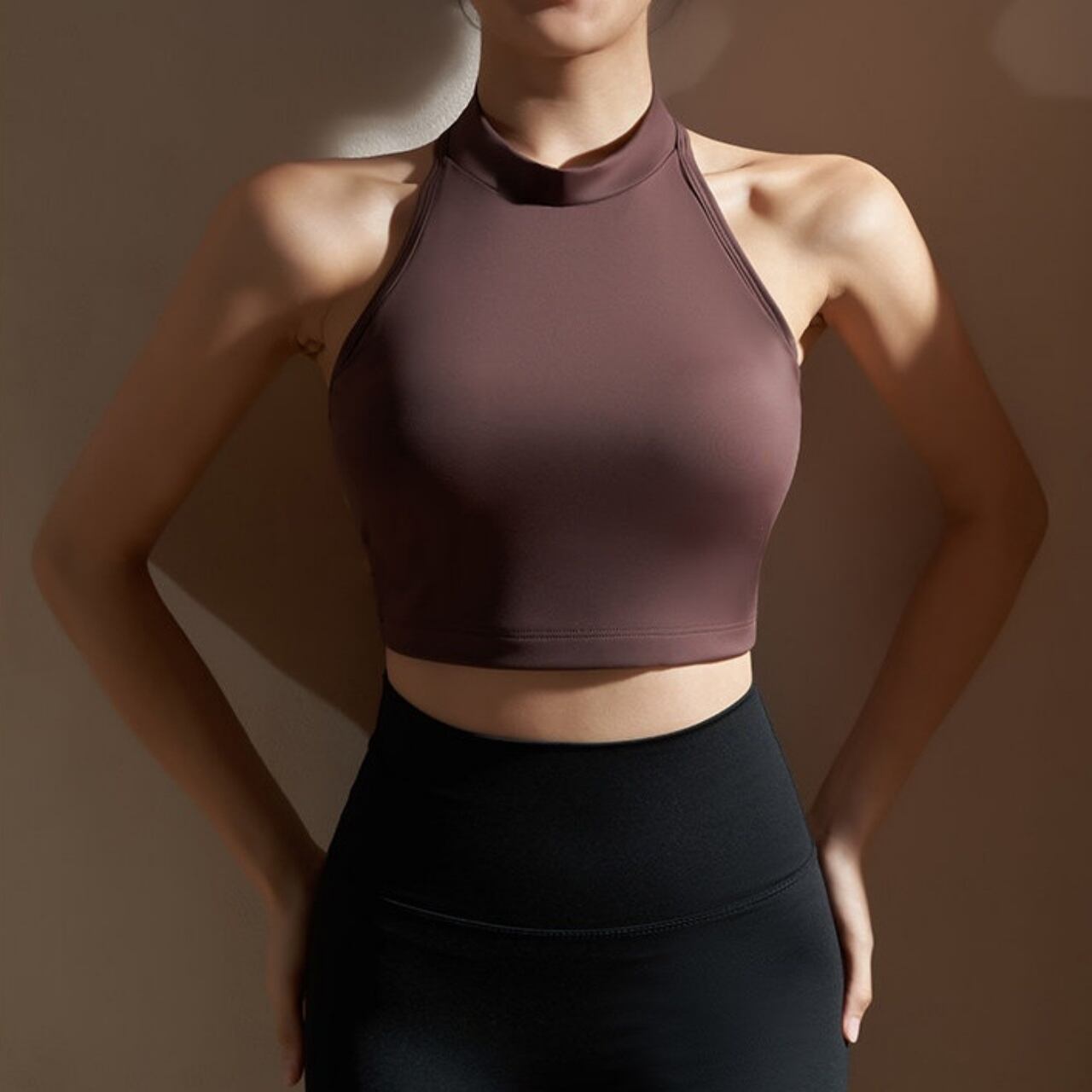 首元までしっかりホールドするハイネックデザインが、動きの多いヨガやワークアウトでも安定感をキープ。