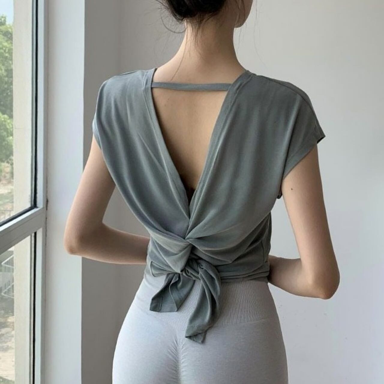 背中に大胆なツイストデザインをあしらった、抜け感たっぷりのバックシャンTシャツ。