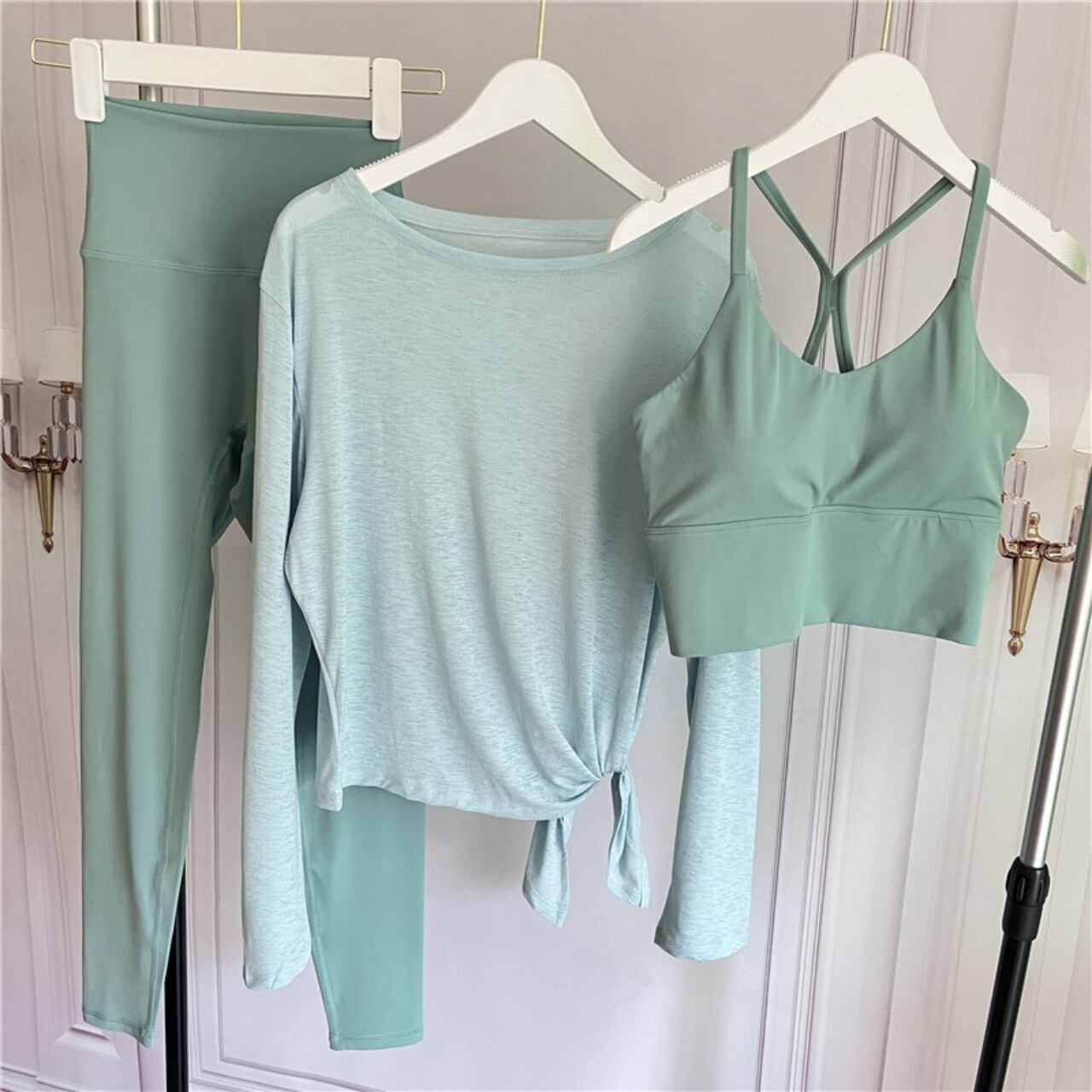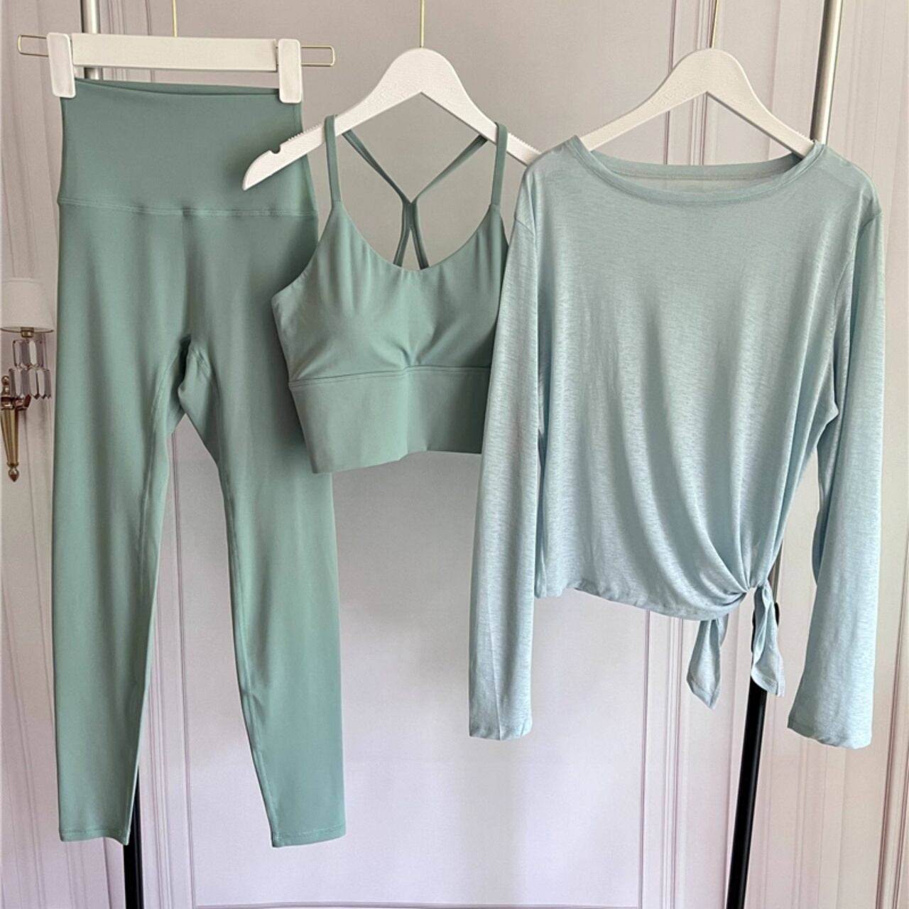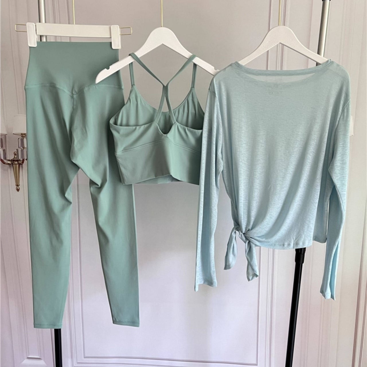 ヨガ・ピラティス・ワークアウトまで幅広く使える、爽やかで上品なワンカラーコーデ。