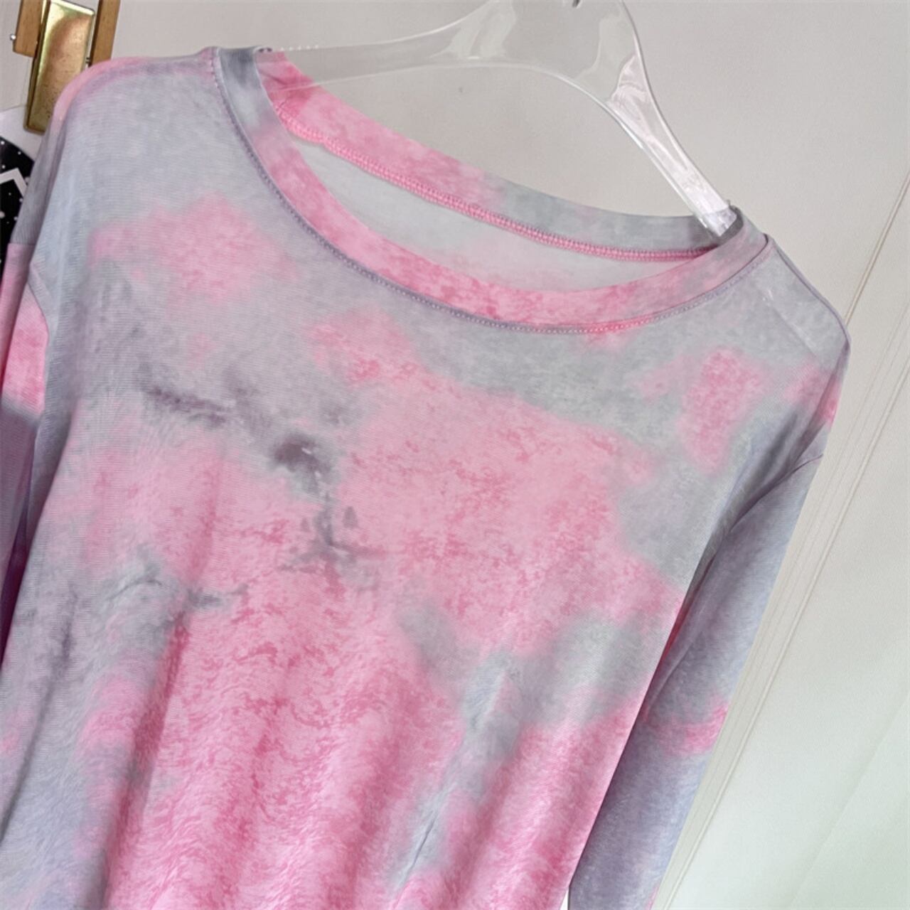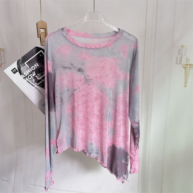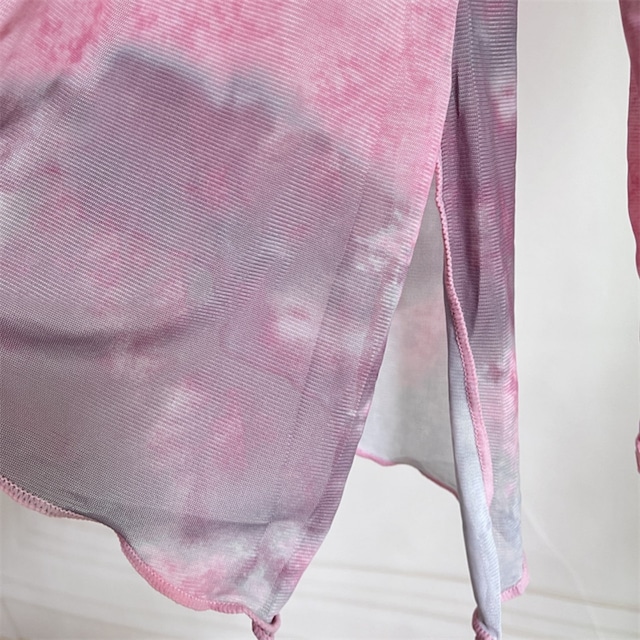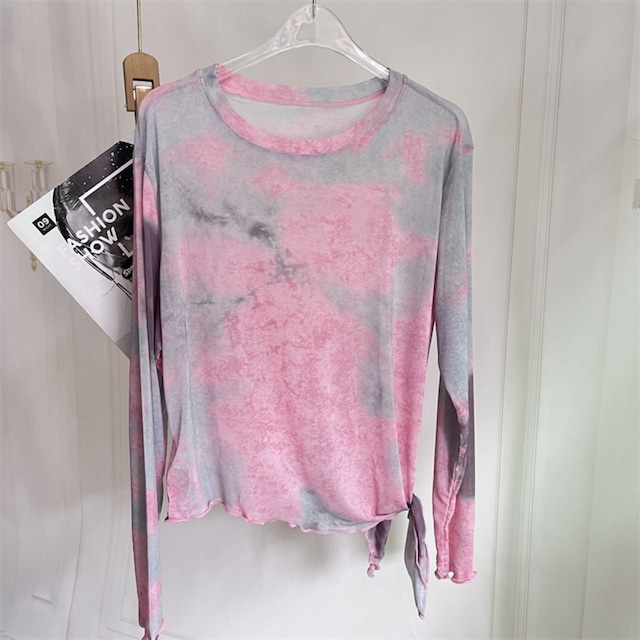 くすみピンク×グレーの柔らかいタイダイが、ふわっと包み込むようなニュアンスコーデ。