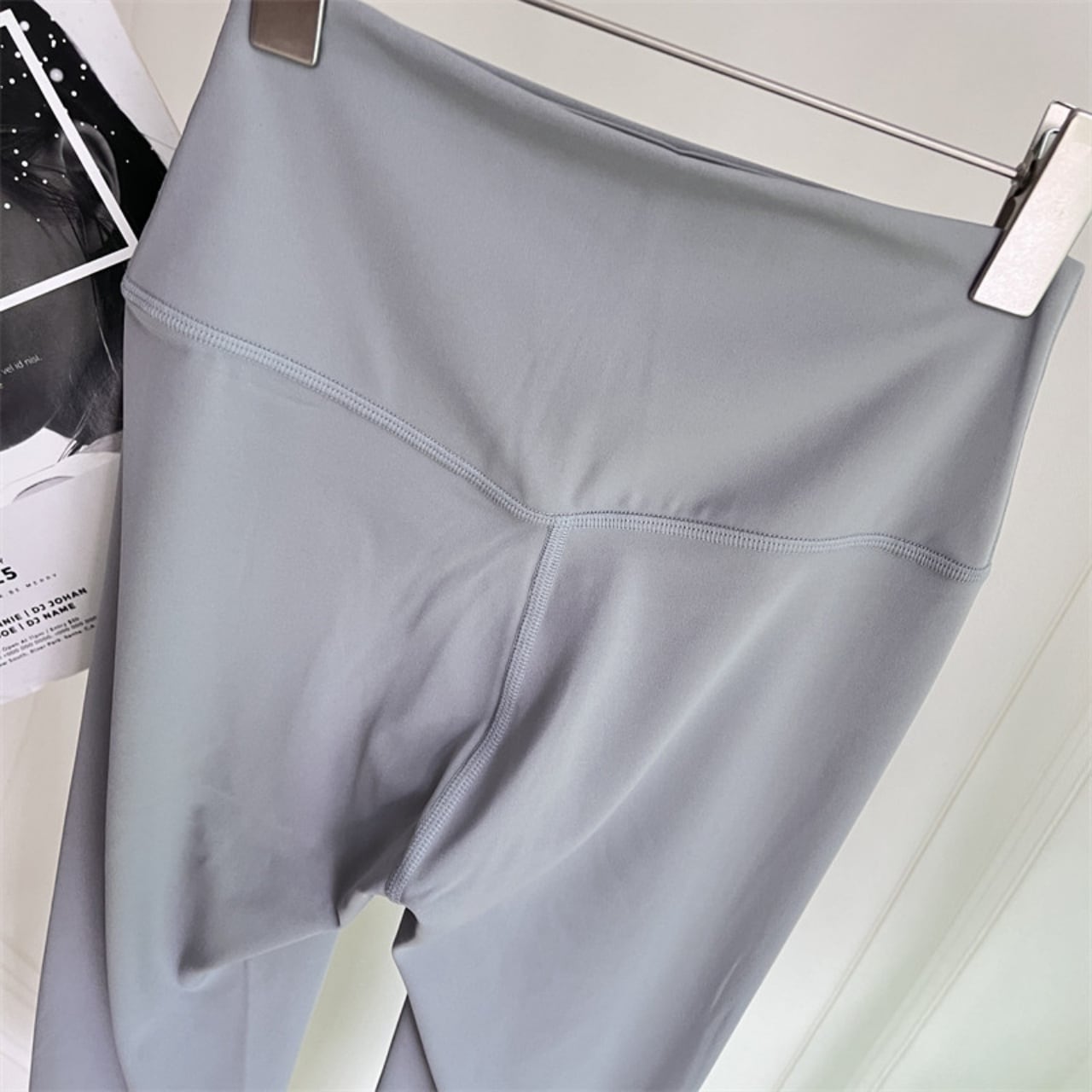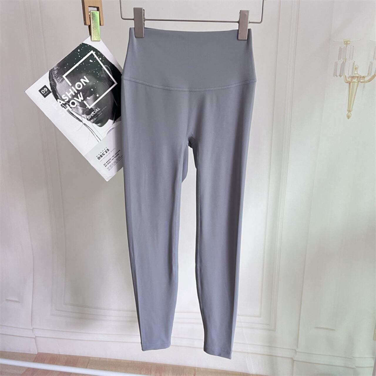 ベーシックなグレーレギンスに、淡いピンクブラを重ねて女性らしさを引き立てつつ、落ち着いた印象に。