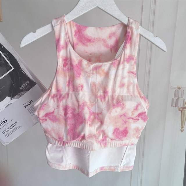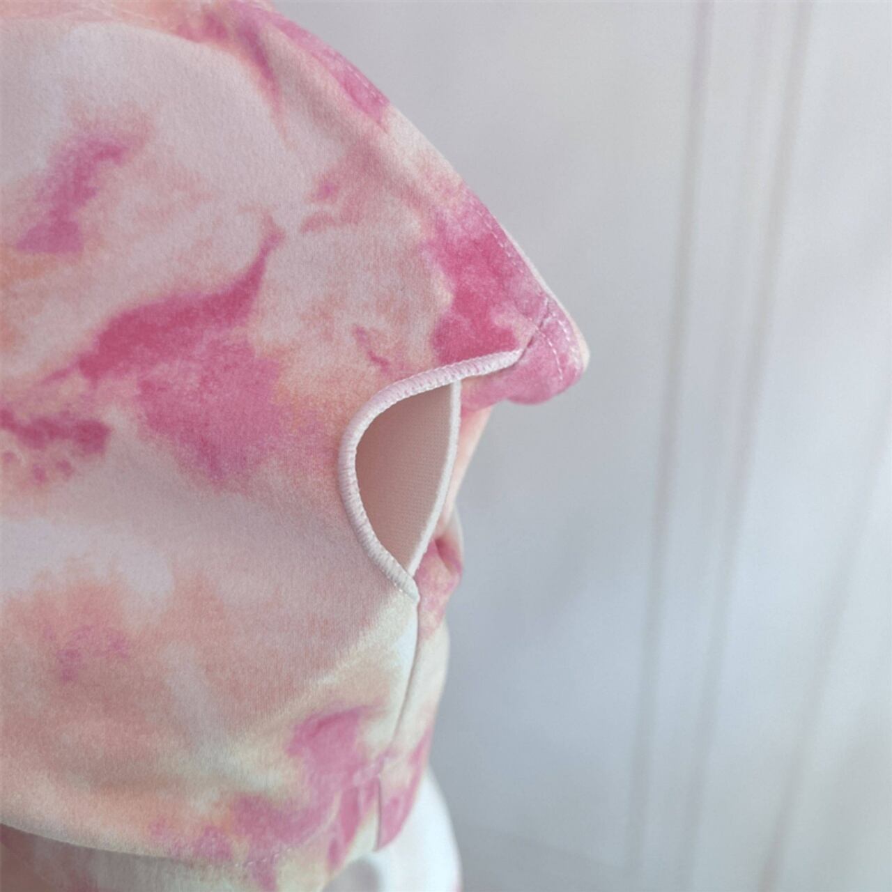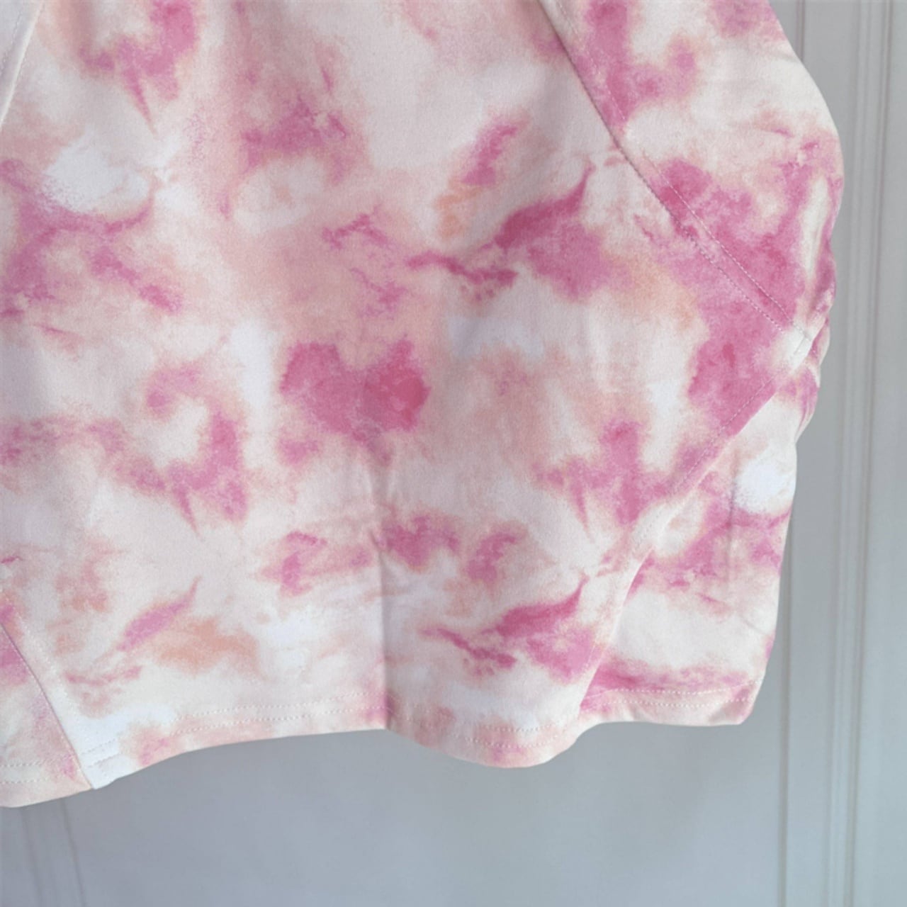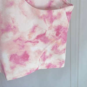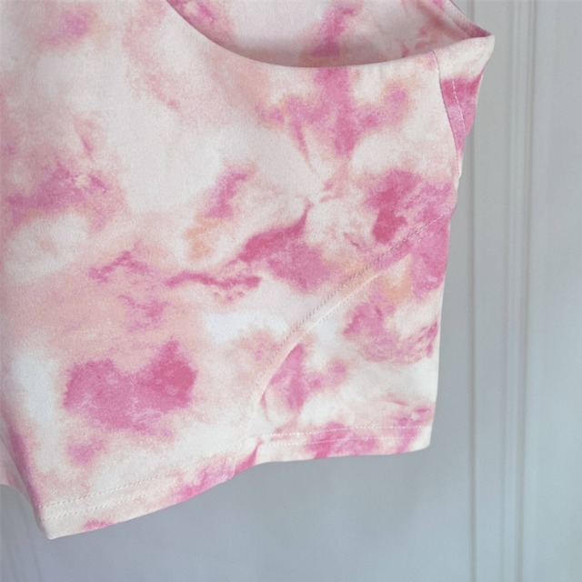 柔らかいピンクのタイダイ柄トップを合わせて、女性らしさと元気さを両立。