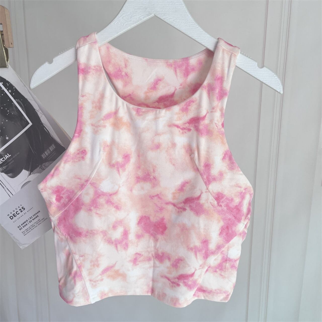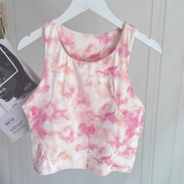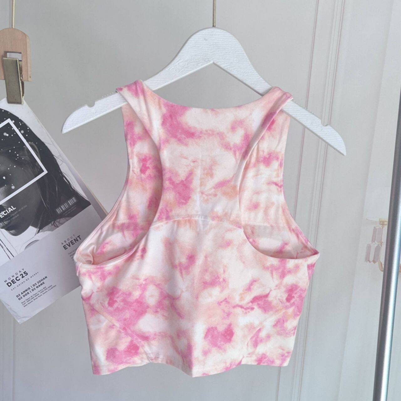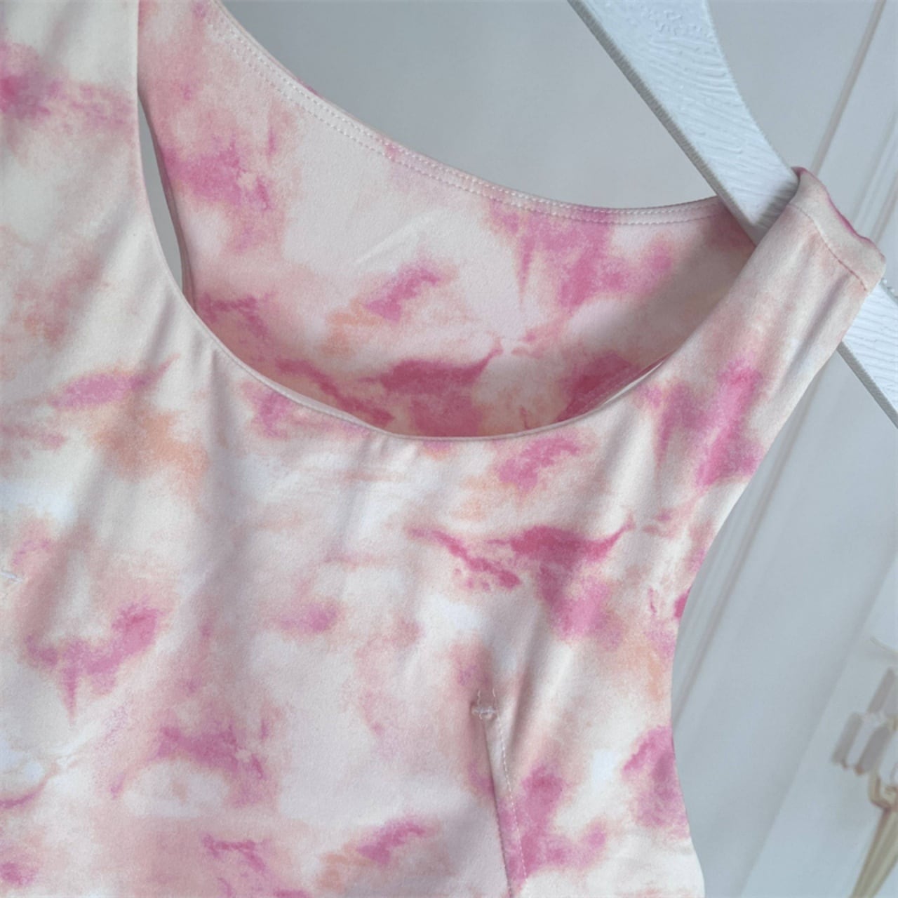 柔らかいピンクのタイダイ柄トップを合わせて、女性らしさと元気さを両立。