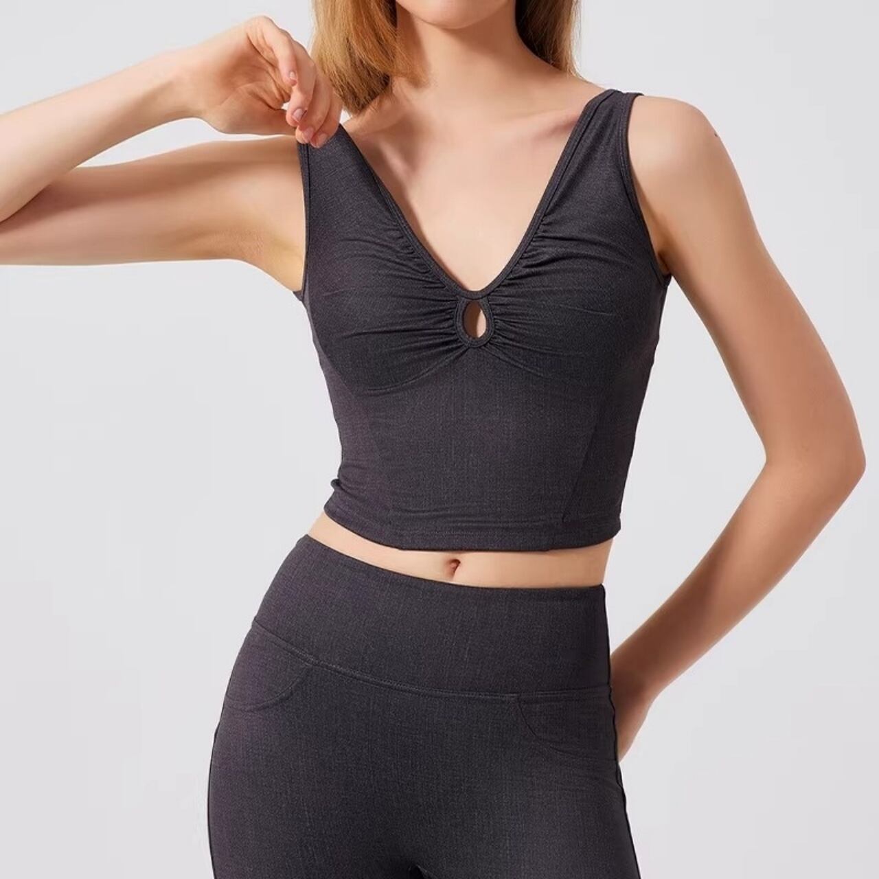 しっかり支えるのに締め付けない快適設計で、ヨガ・フィットネス両方に対応。
