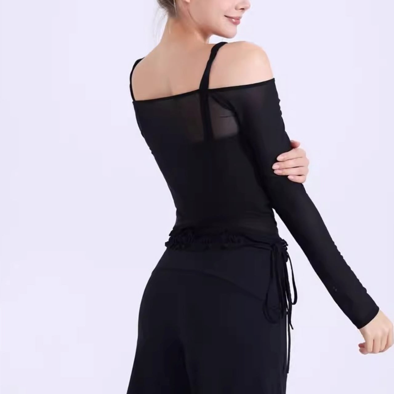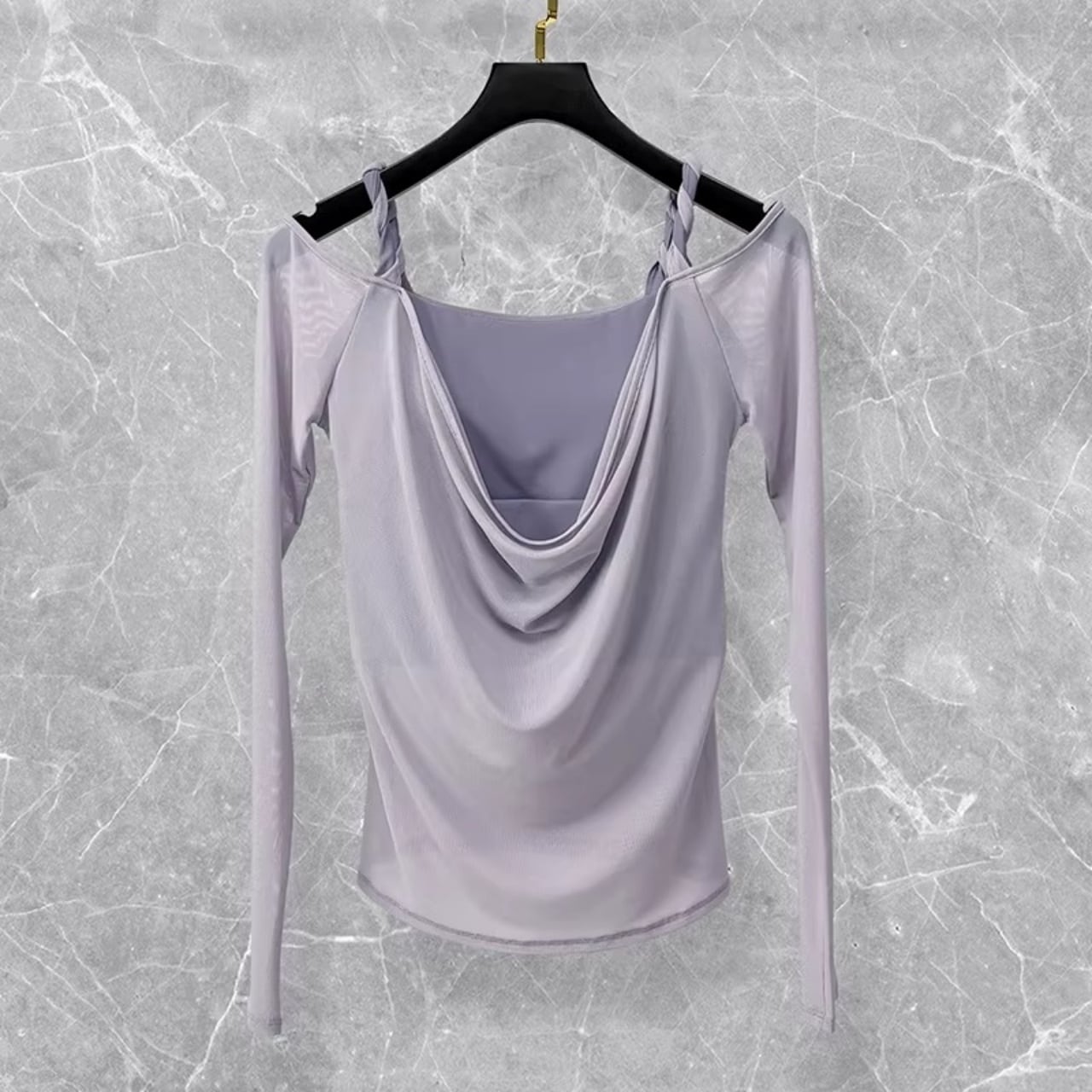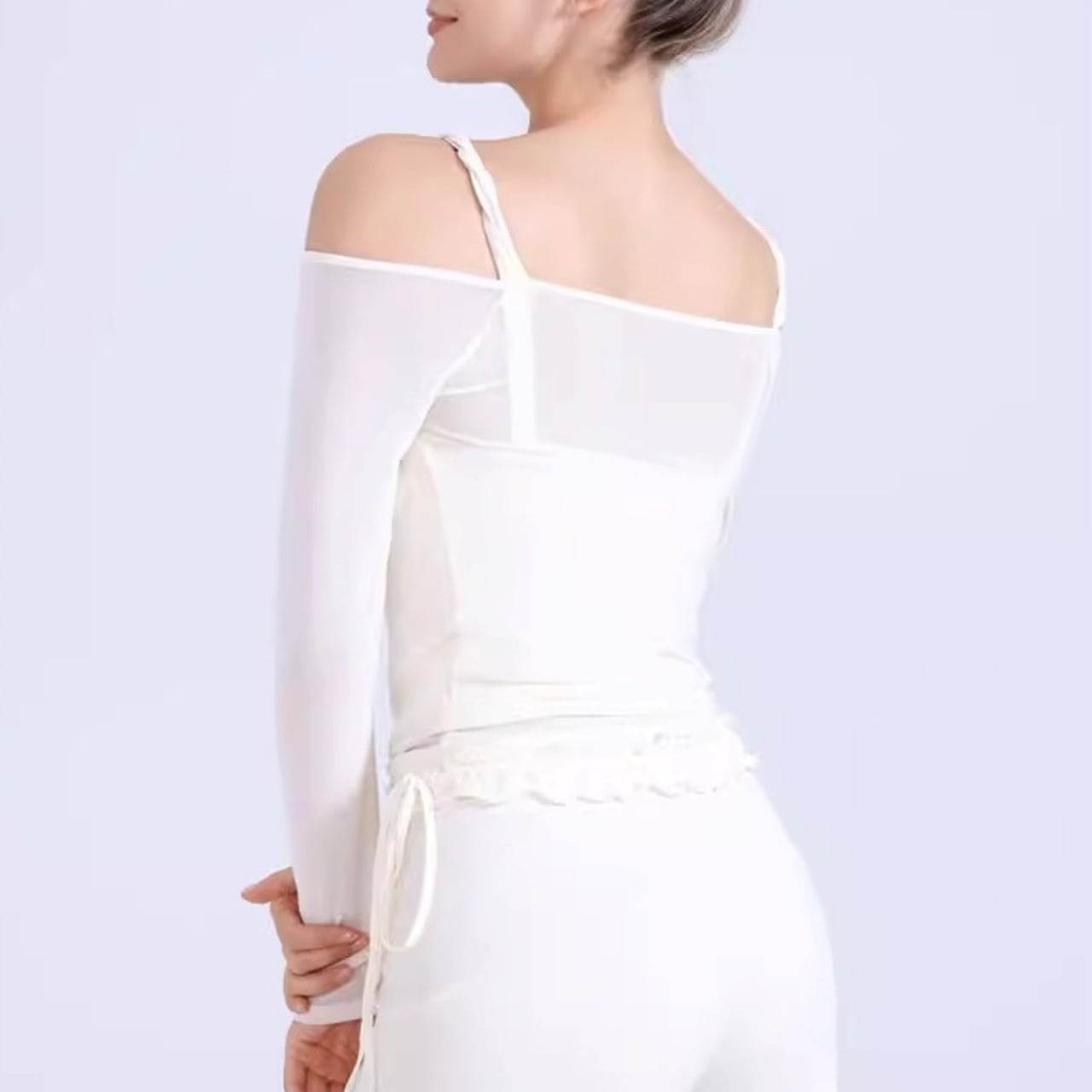 透け感のあるトップが女性らしさを引き立て、動くたびに美しいシルエットを描きます。