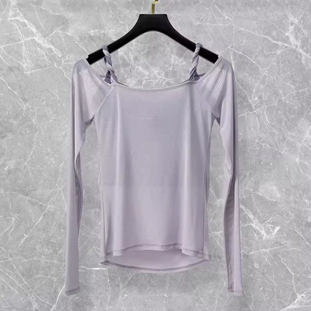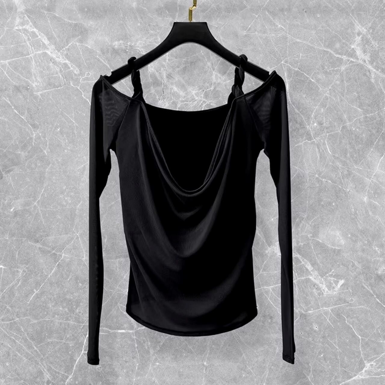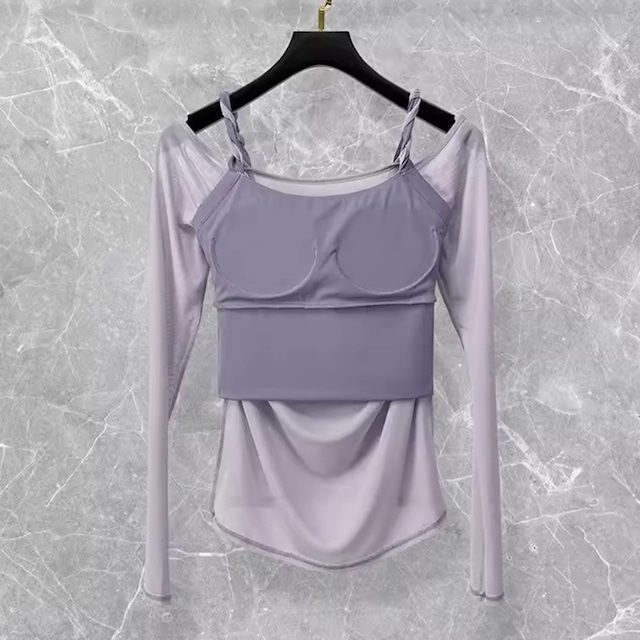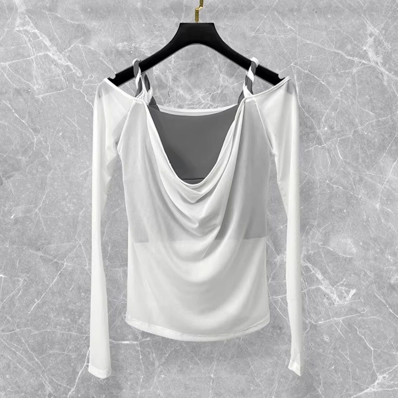 透け感のあるトップが女性らしさを引き立て、動くたびに美しいシルエットを描きます。
