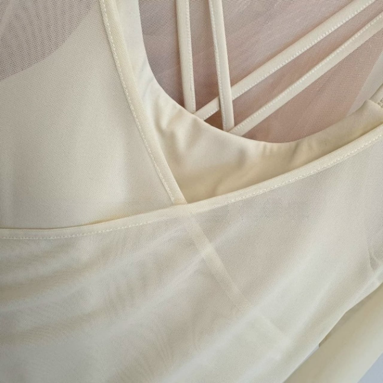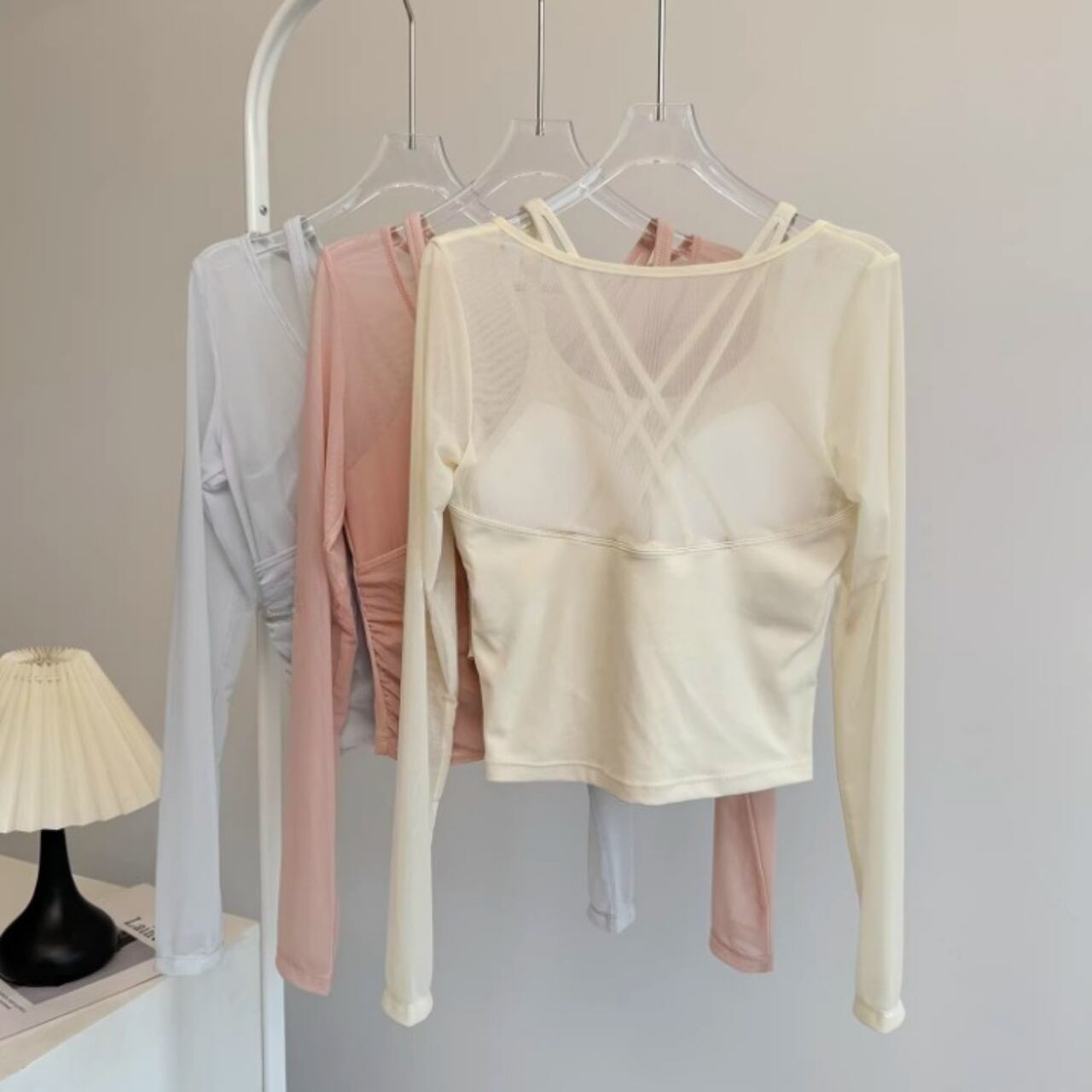 メッシュ素材の軽い着心地と、クロスデザインの美シルエットが魅力。