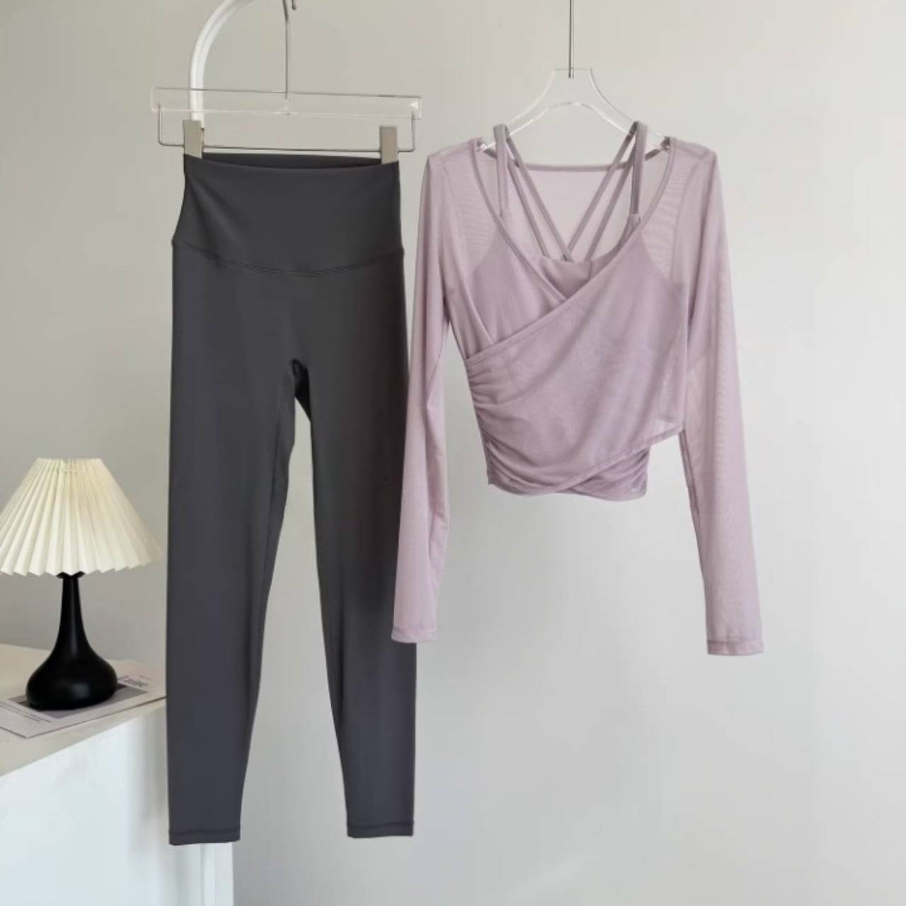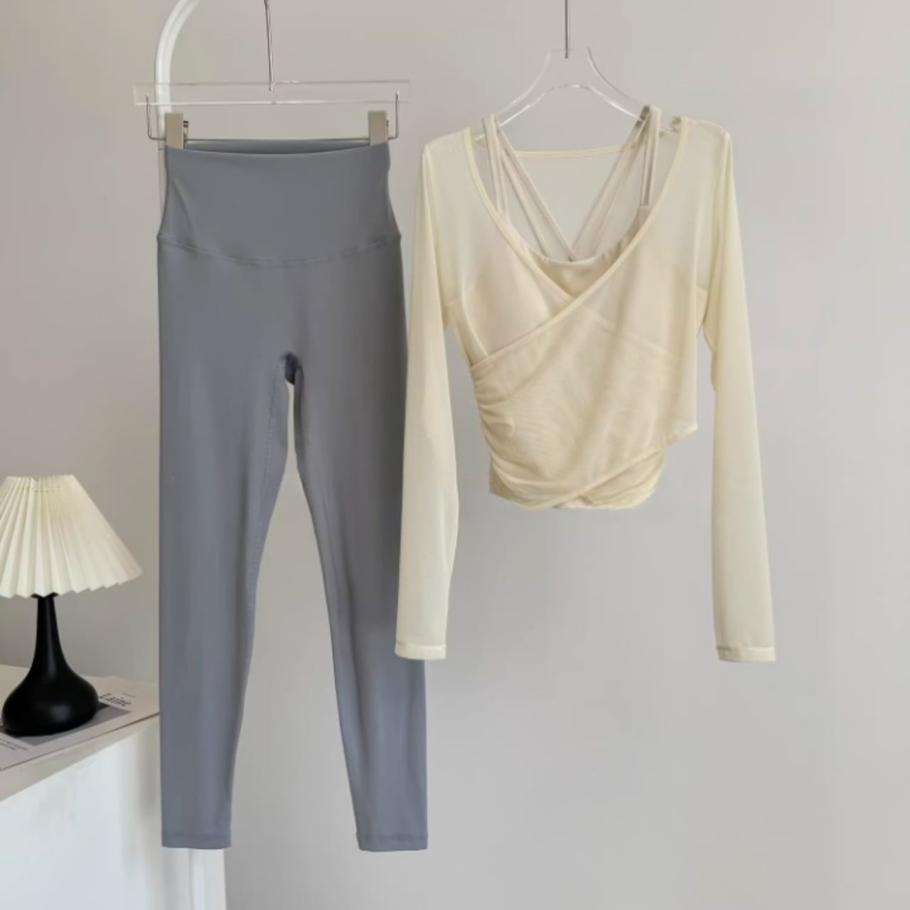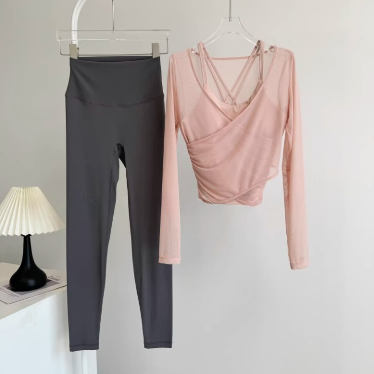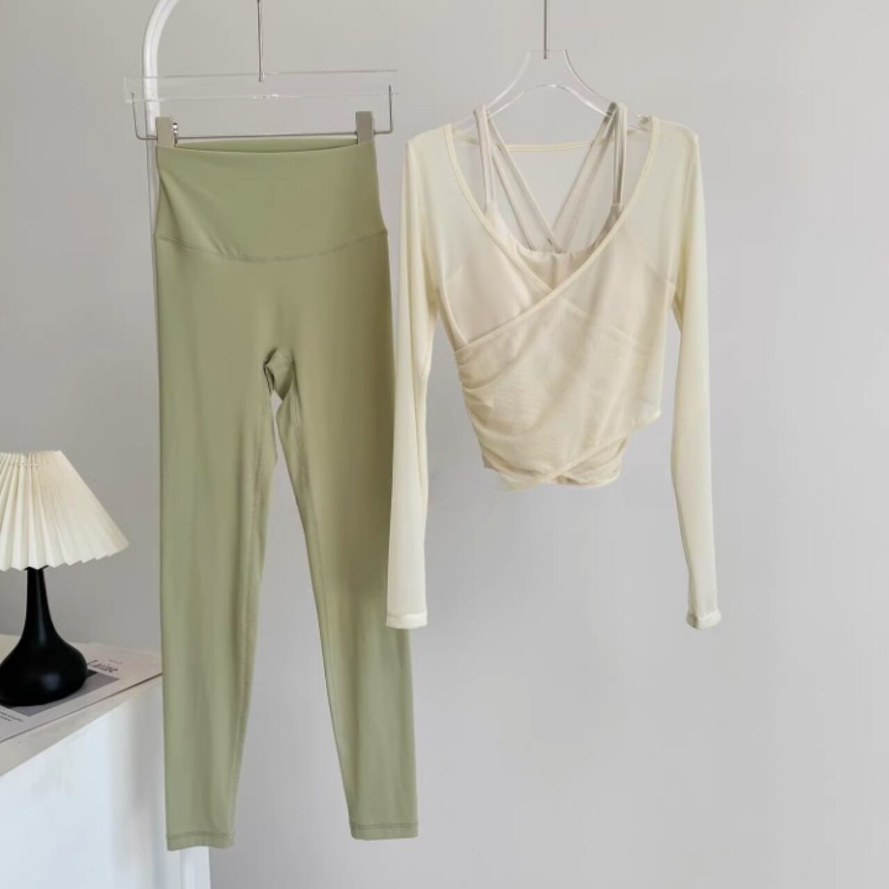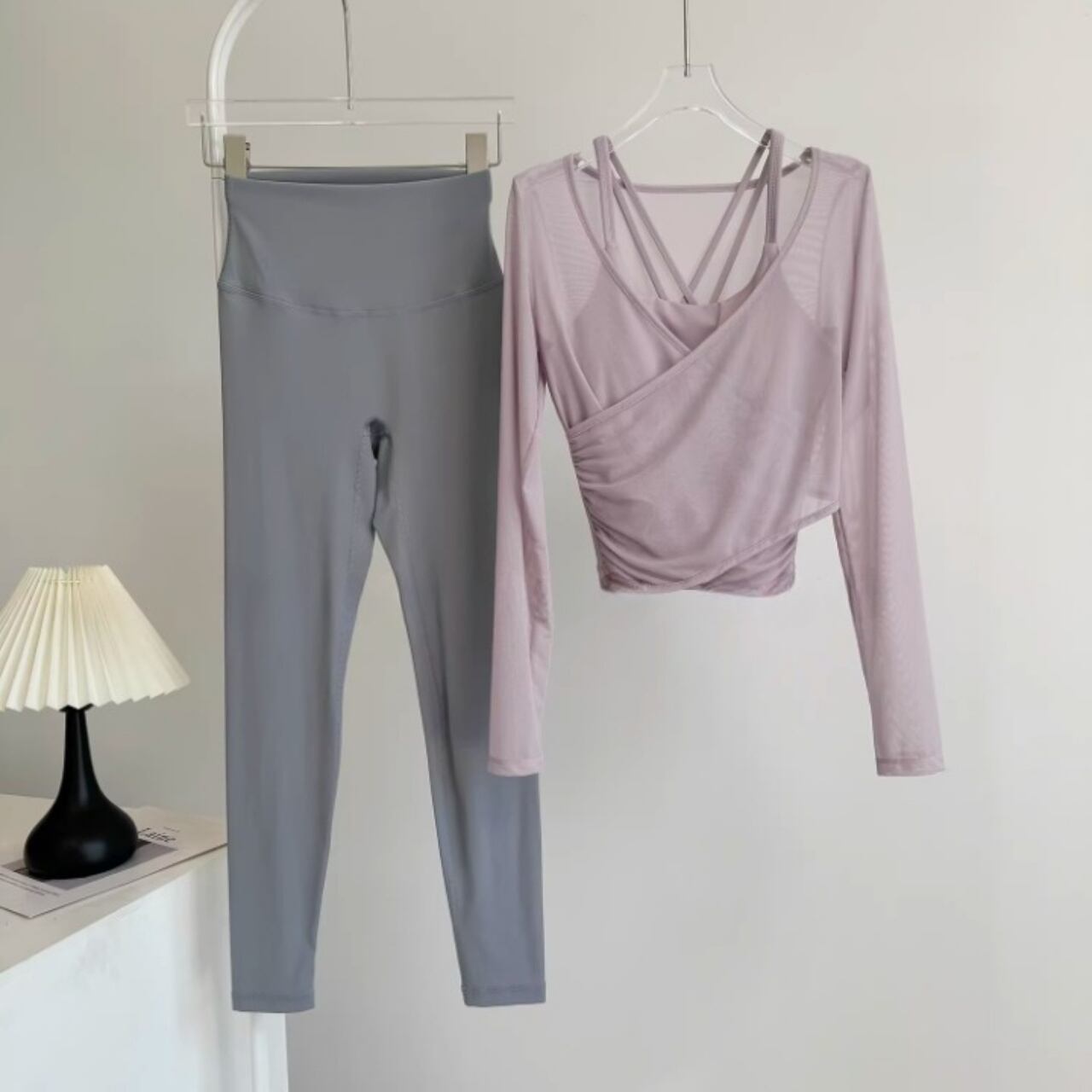 淡いカラーの組み合わせが柔らかい印象をつくり、女性らしいヨガスタイルを演出。