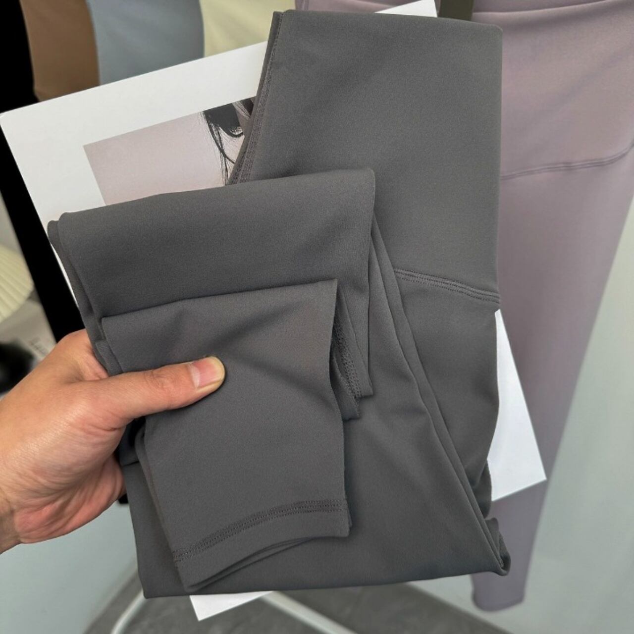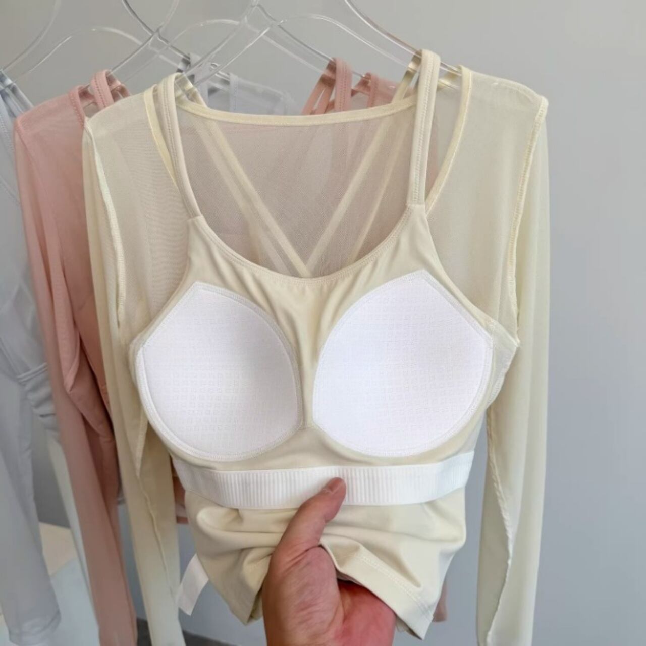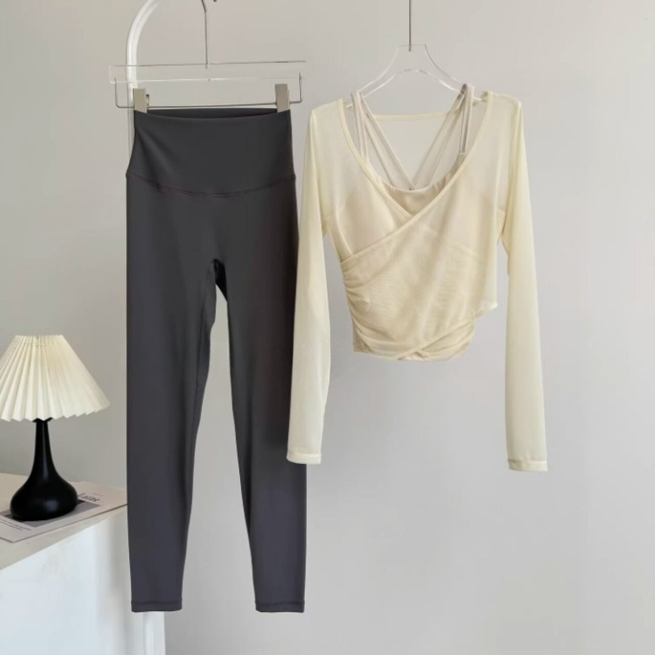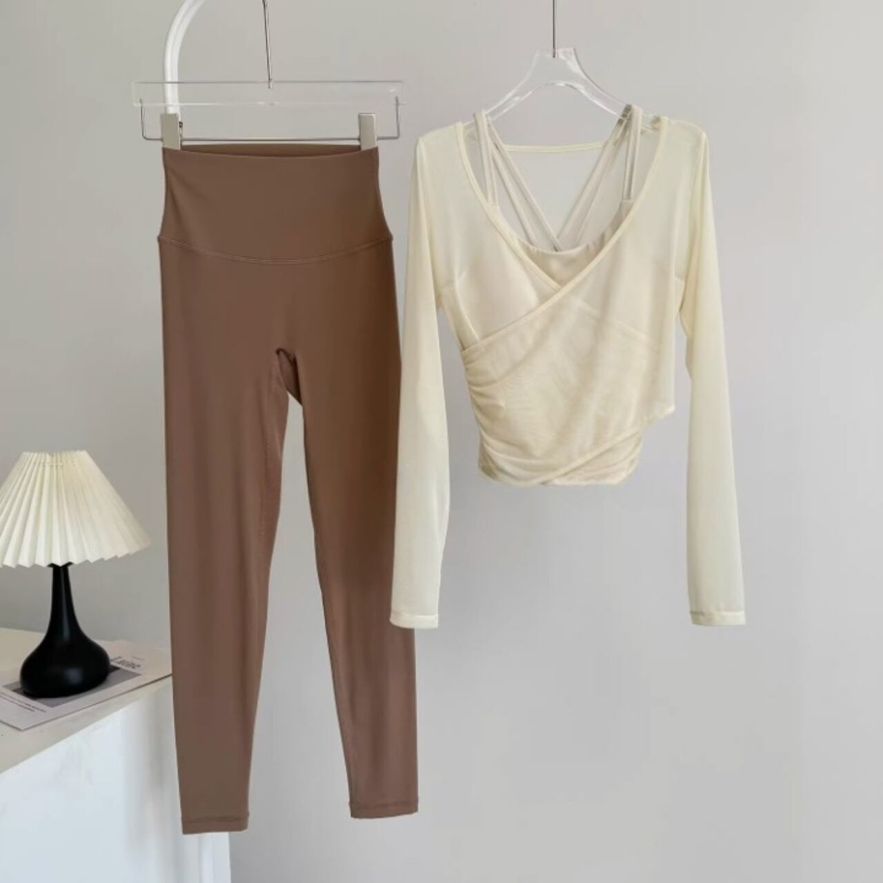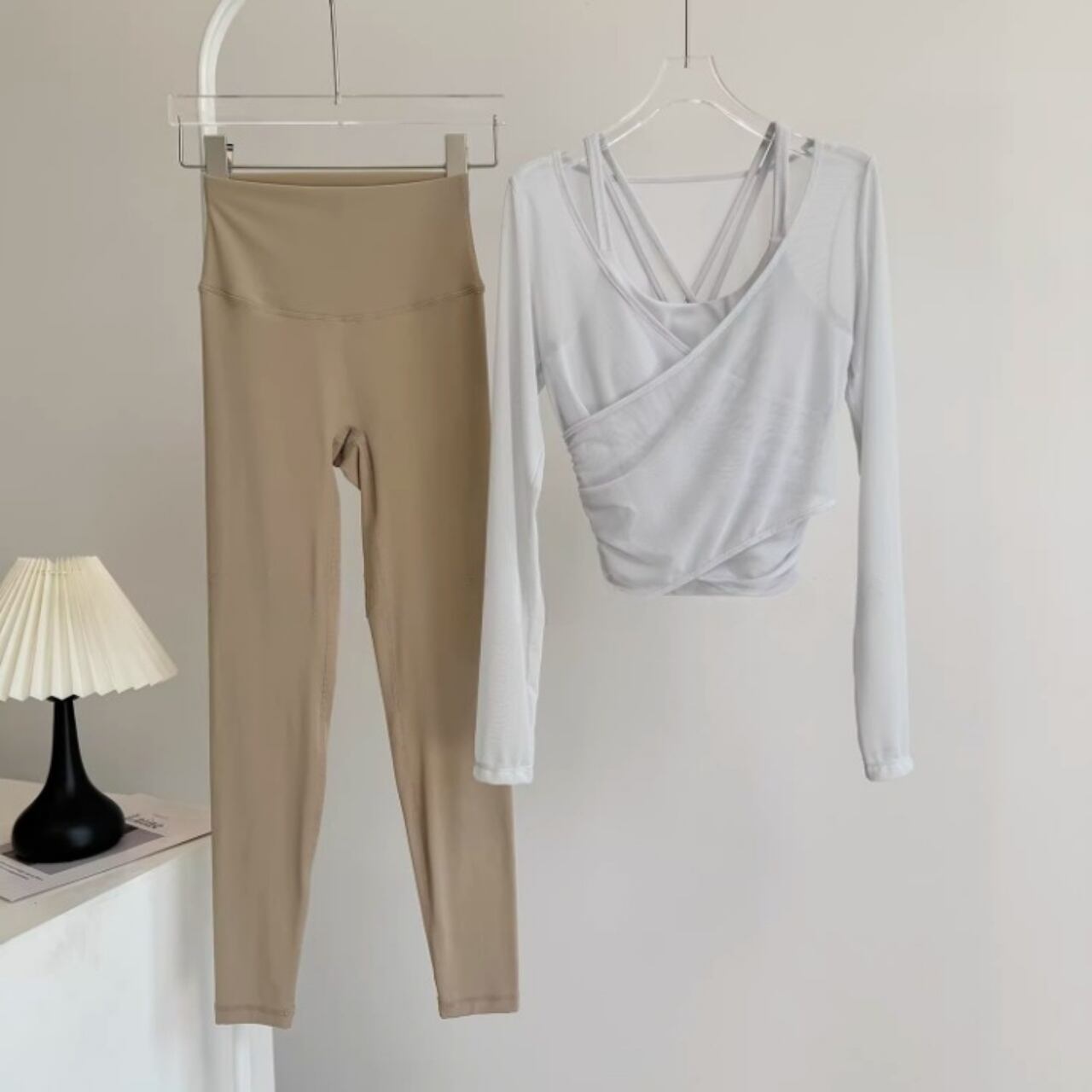 淡いカラーの組み合わせが柔らかい印象をつくり、女性らしいヨガスタイルを演出。