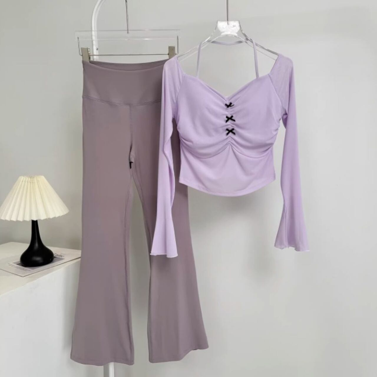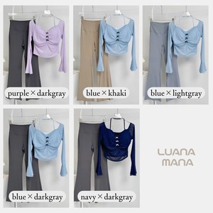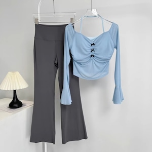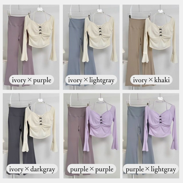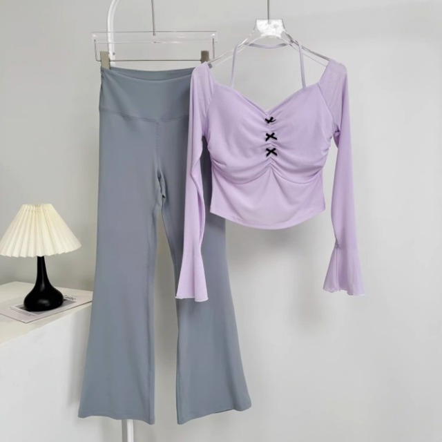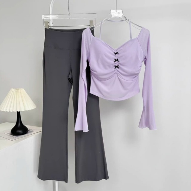 胸元のギャザーと小さなリボンが、上品な可愛さをプラスするヨガセット。