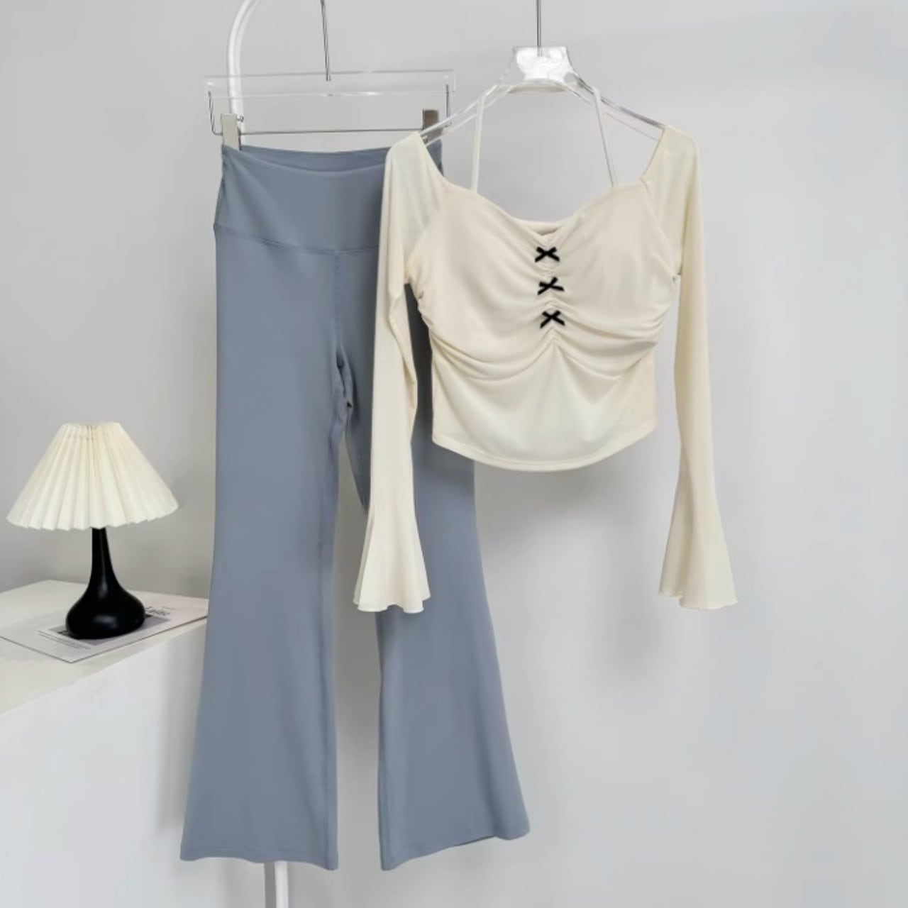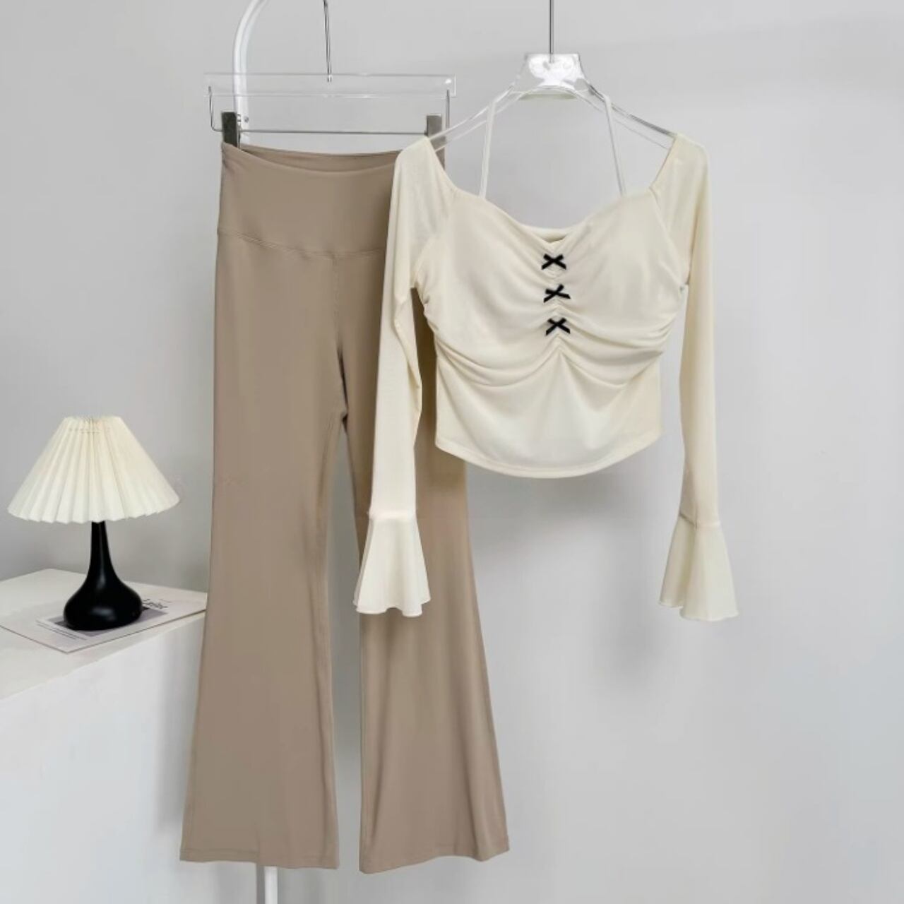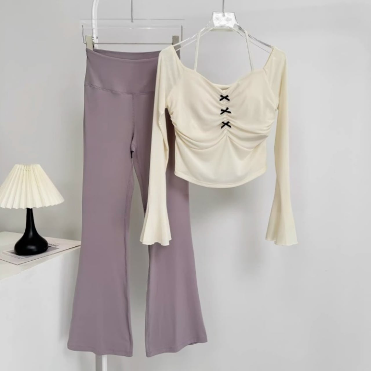 伸縮性のあるフレアパンツが脚を長く見せ、スタイルアップ効果も抜群。