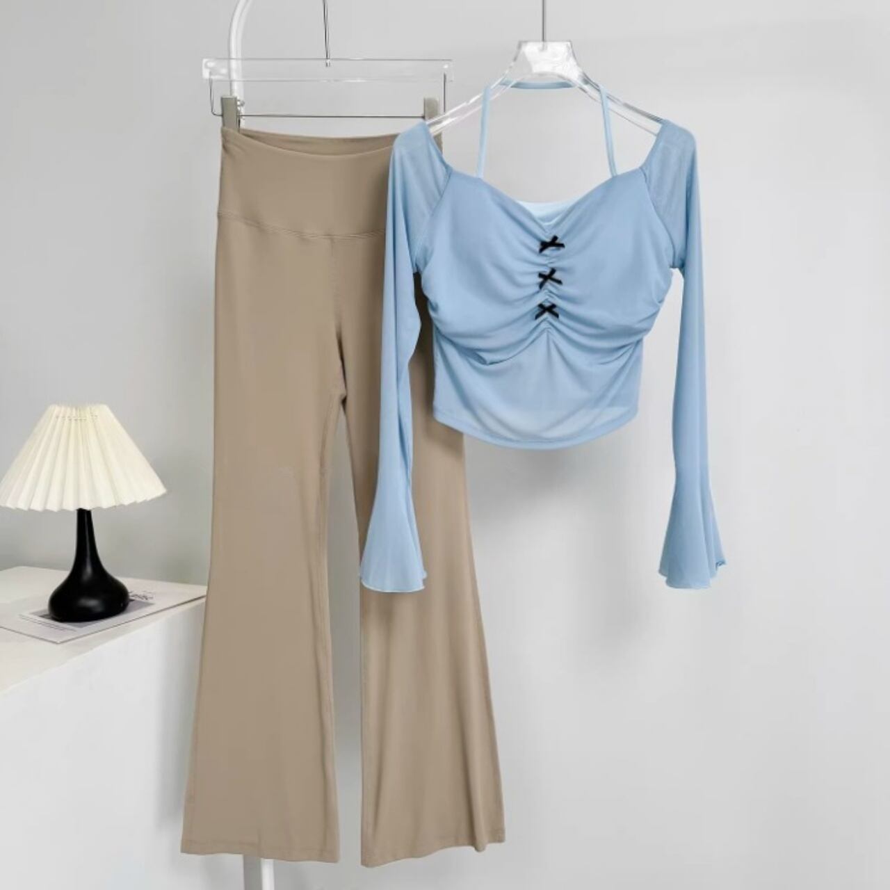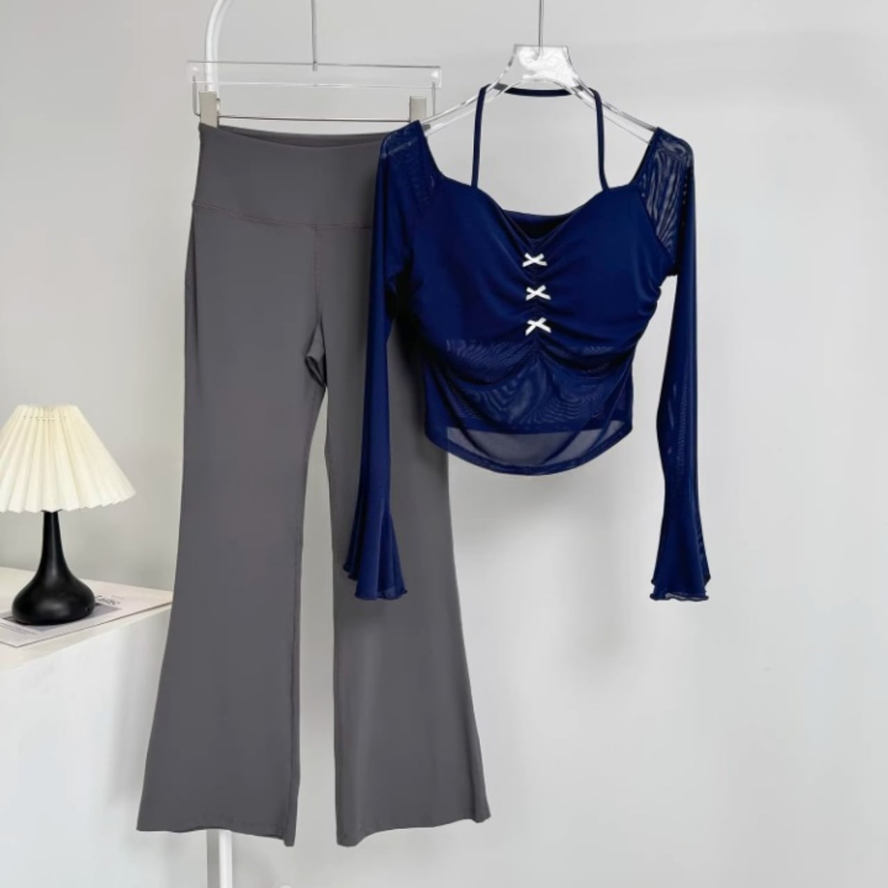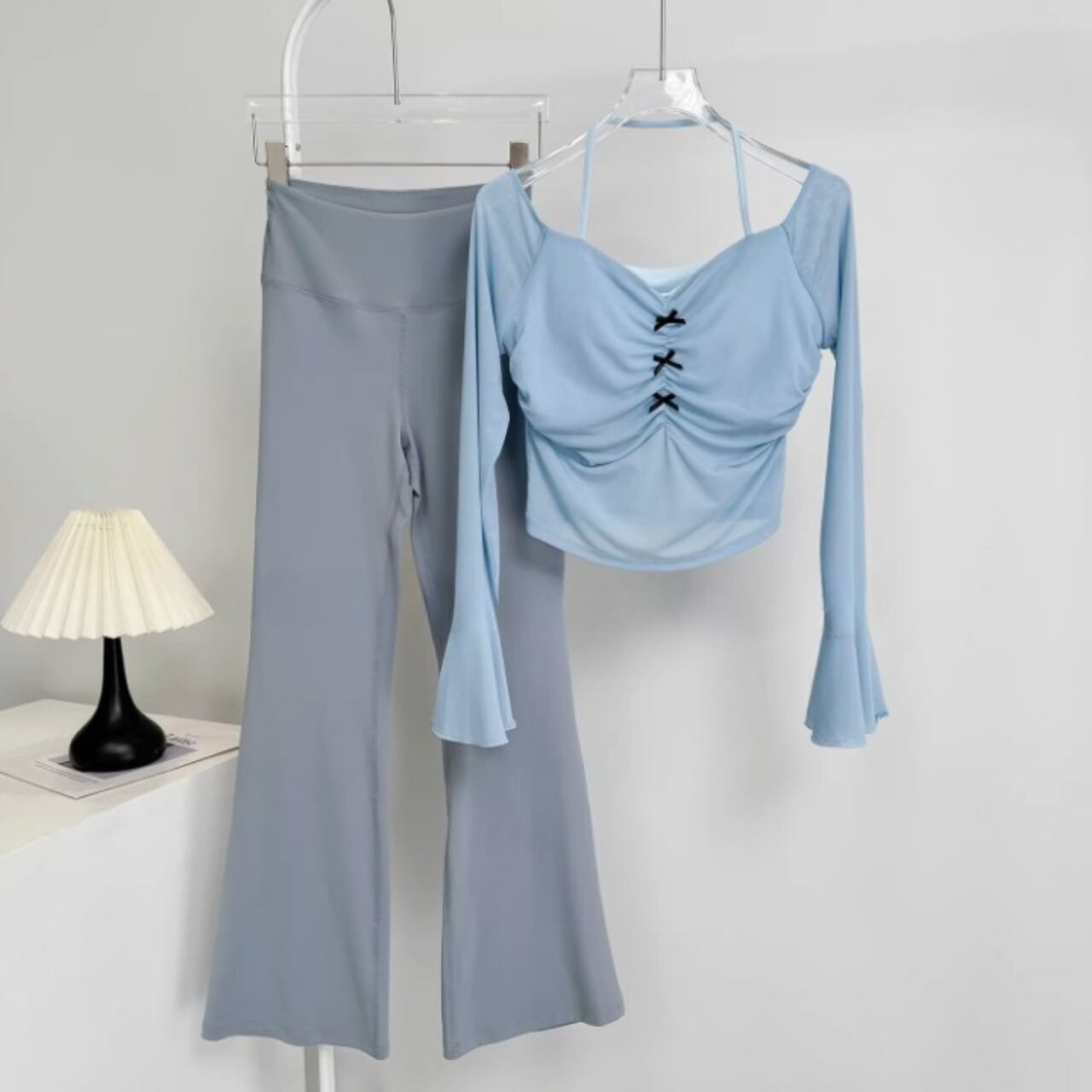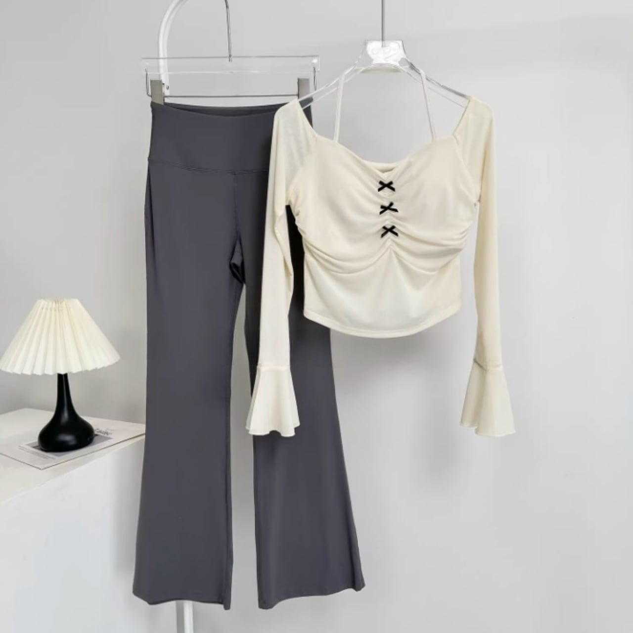 伸縮性のあるフレアパンツが脚を長く見せ、スタイルアップ効果も抜群。