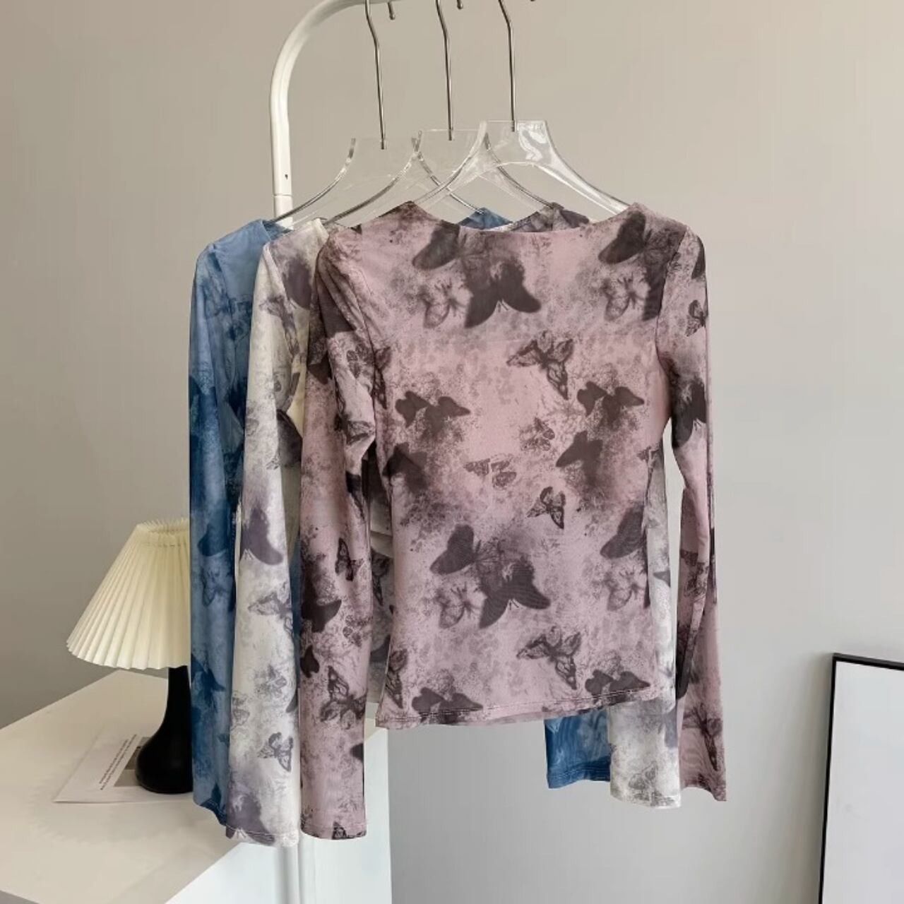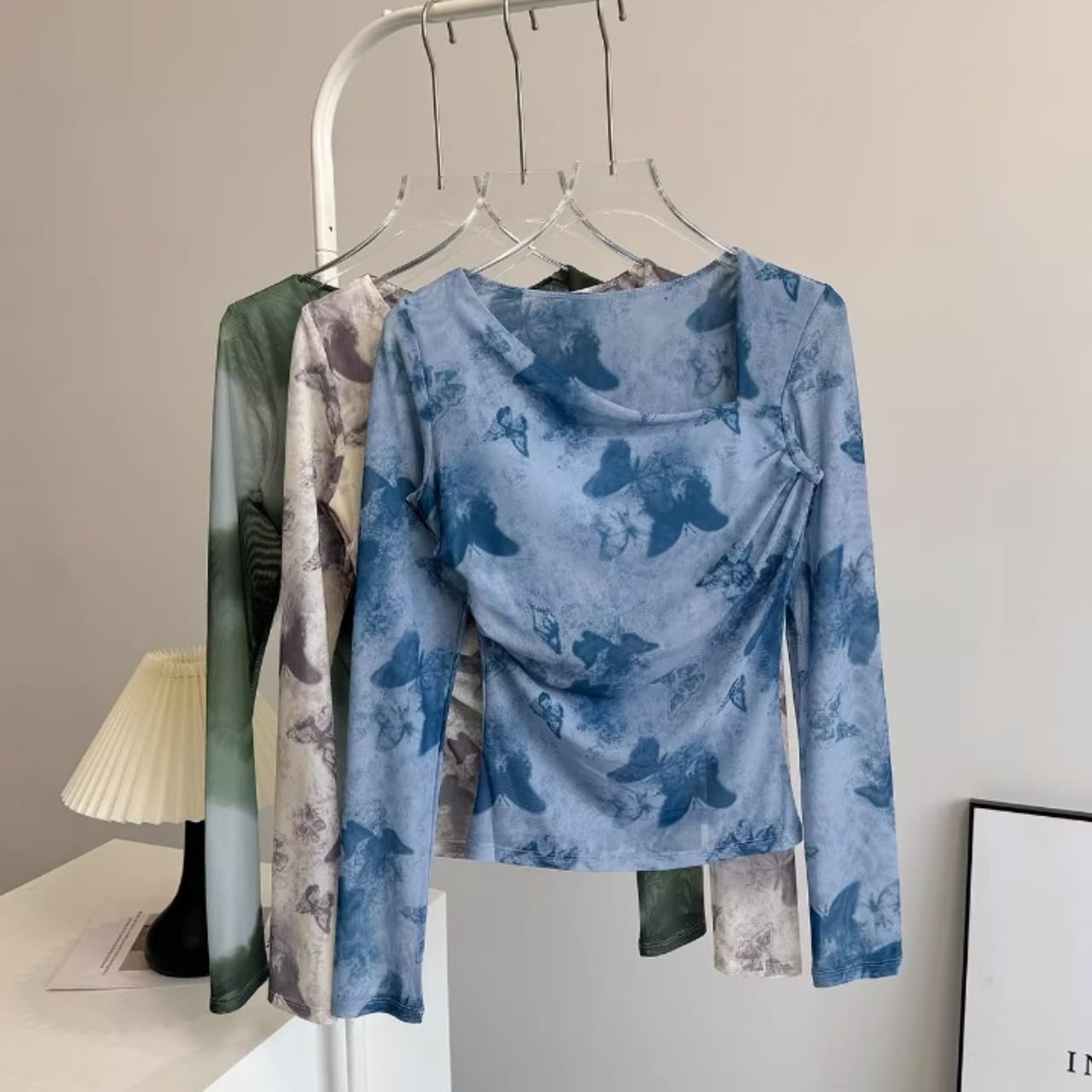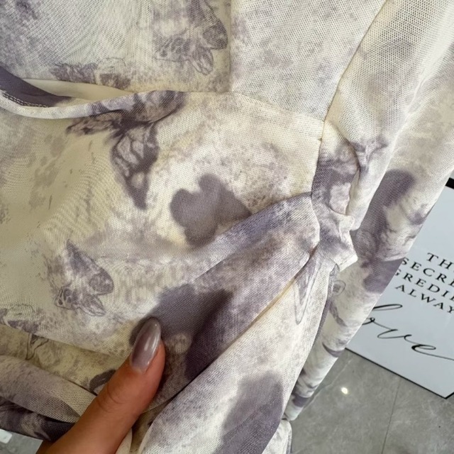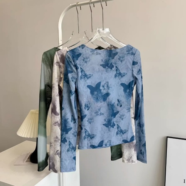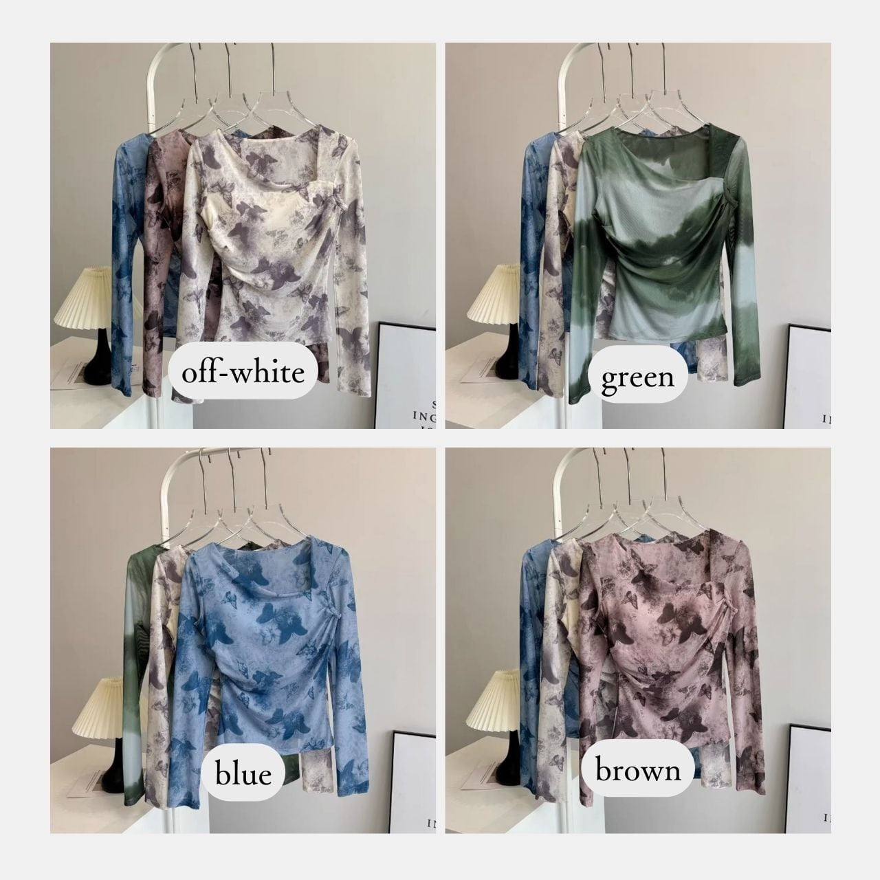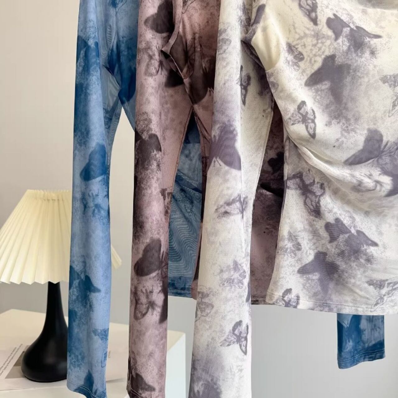 淡いアート柄メッシュが肌を美しく見せるロングスリーブ。