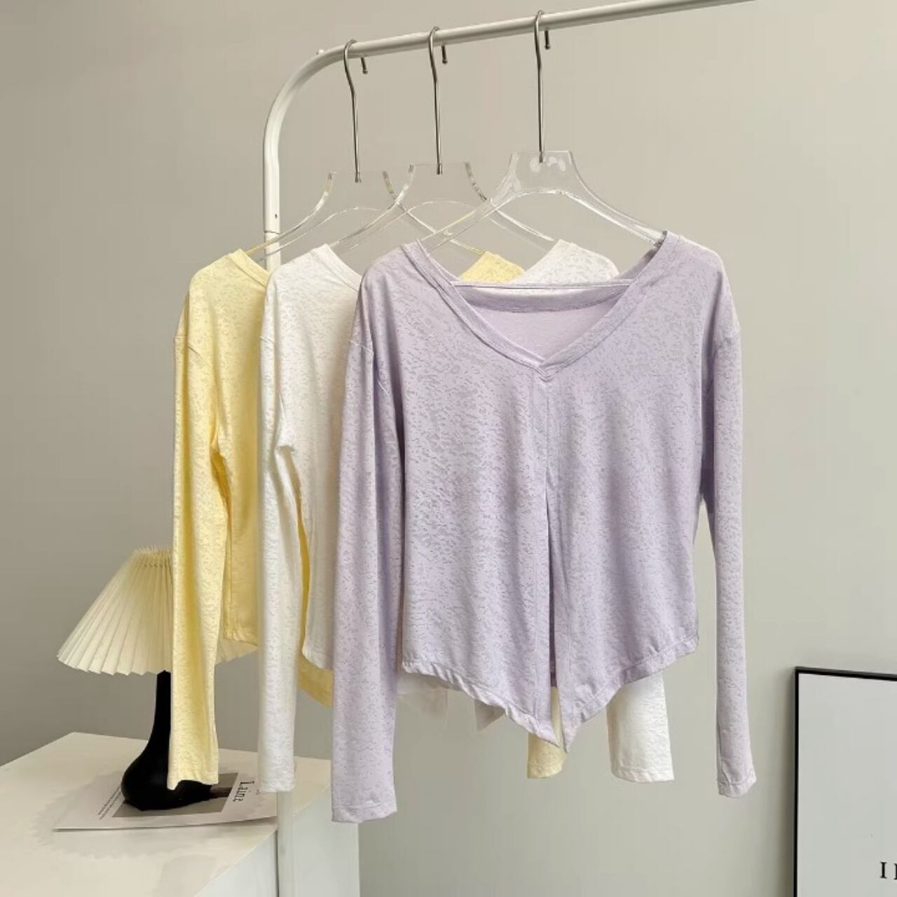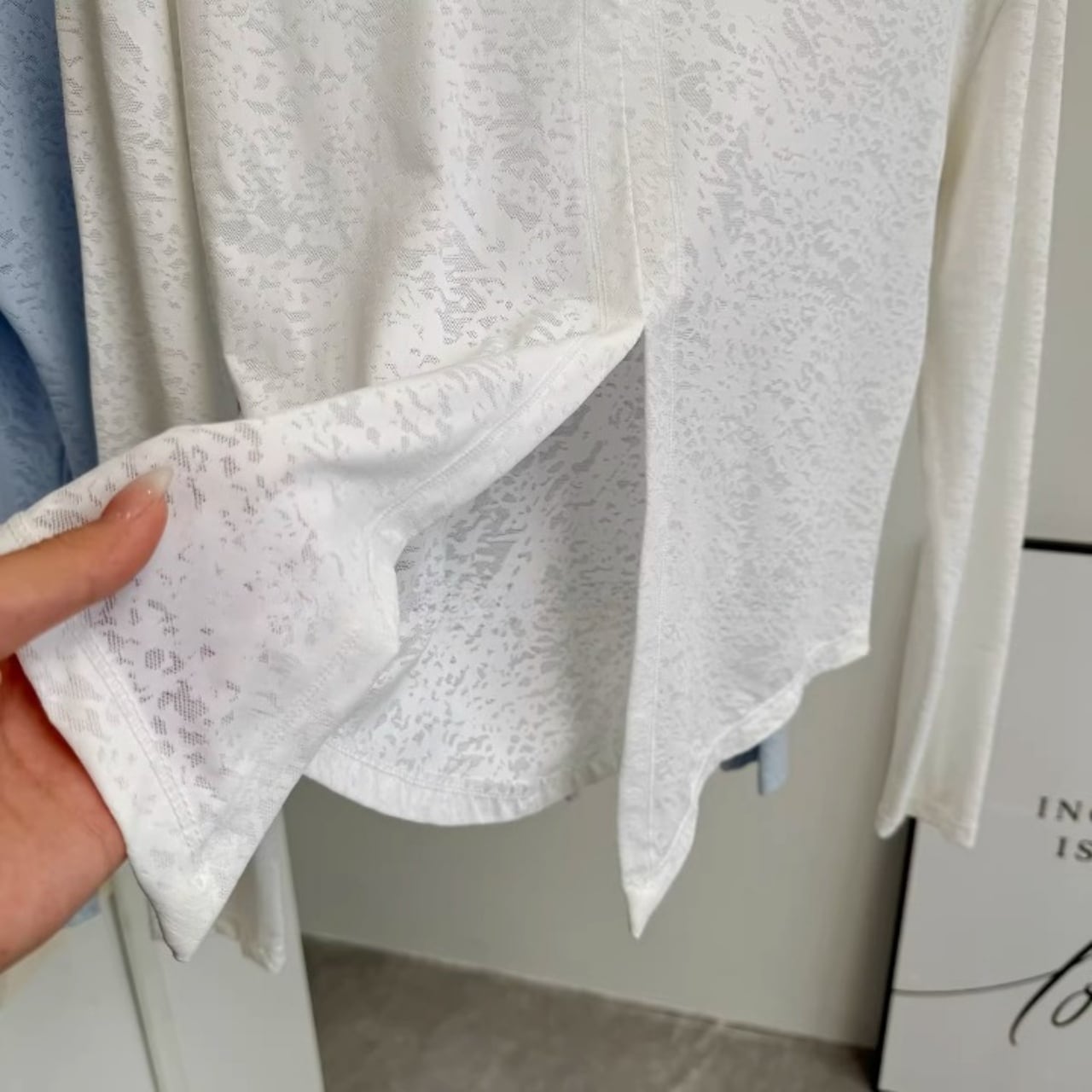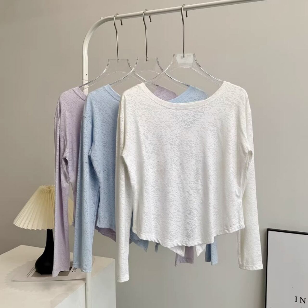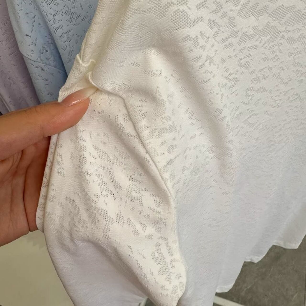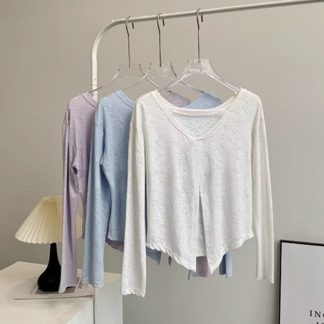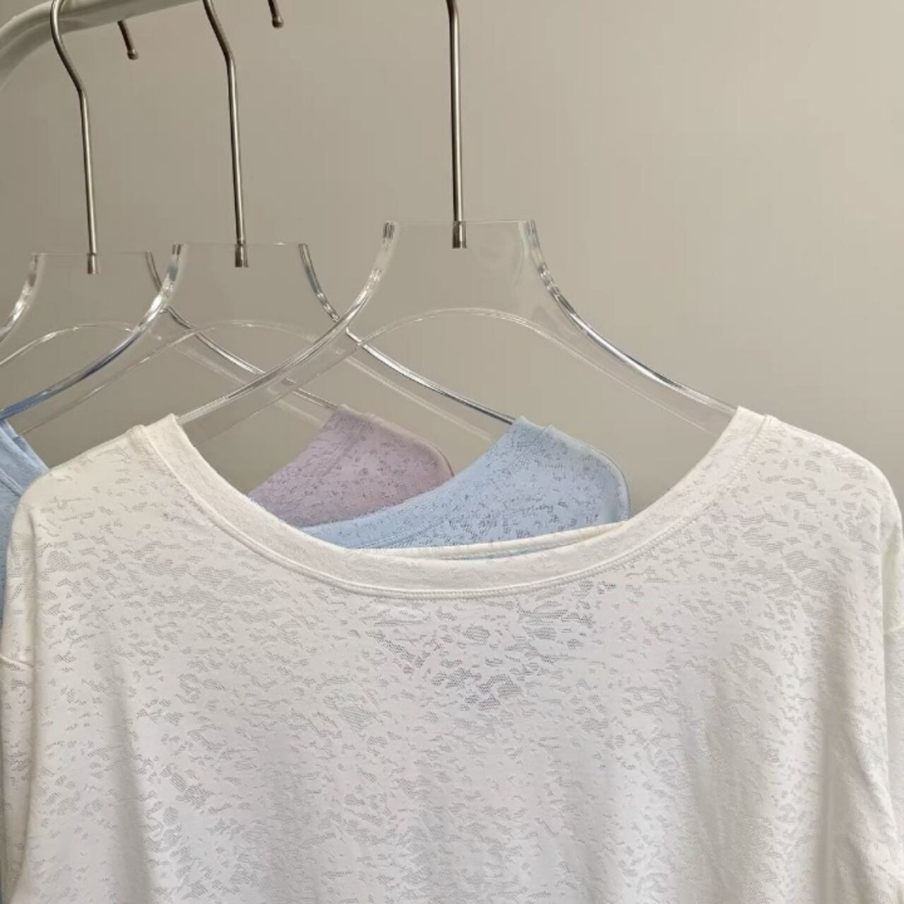 うっすら透けるレース調の表情が女性らしさを引き立てるトップス。
