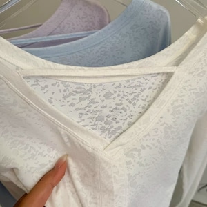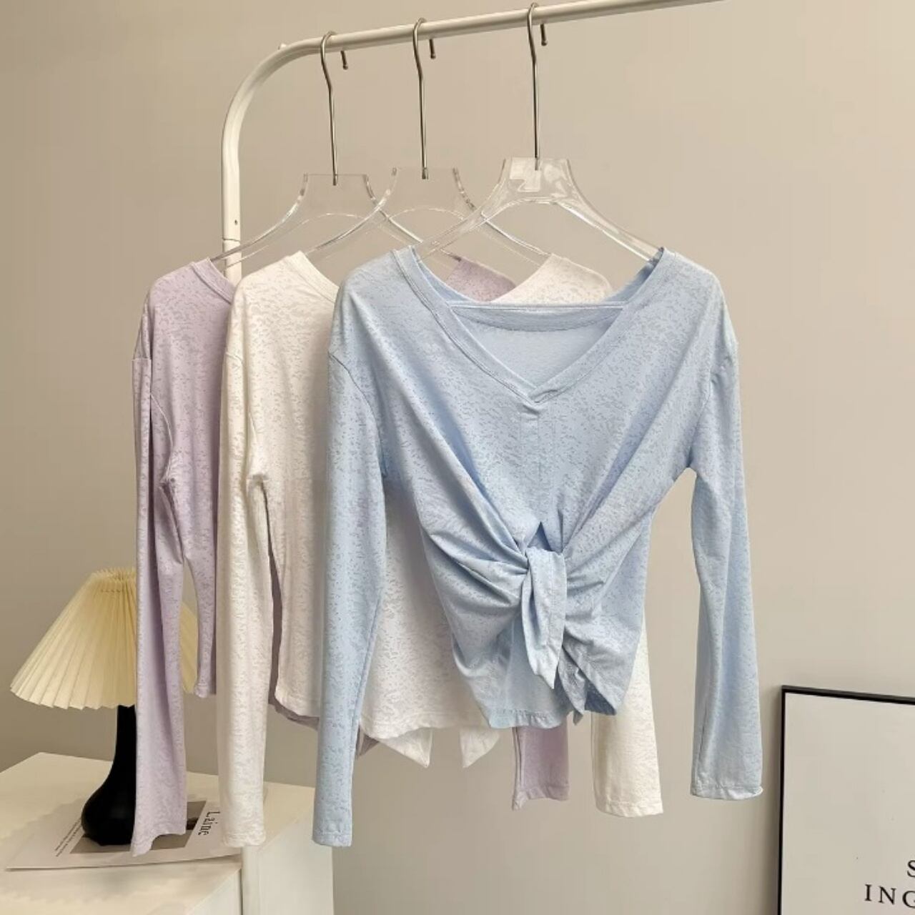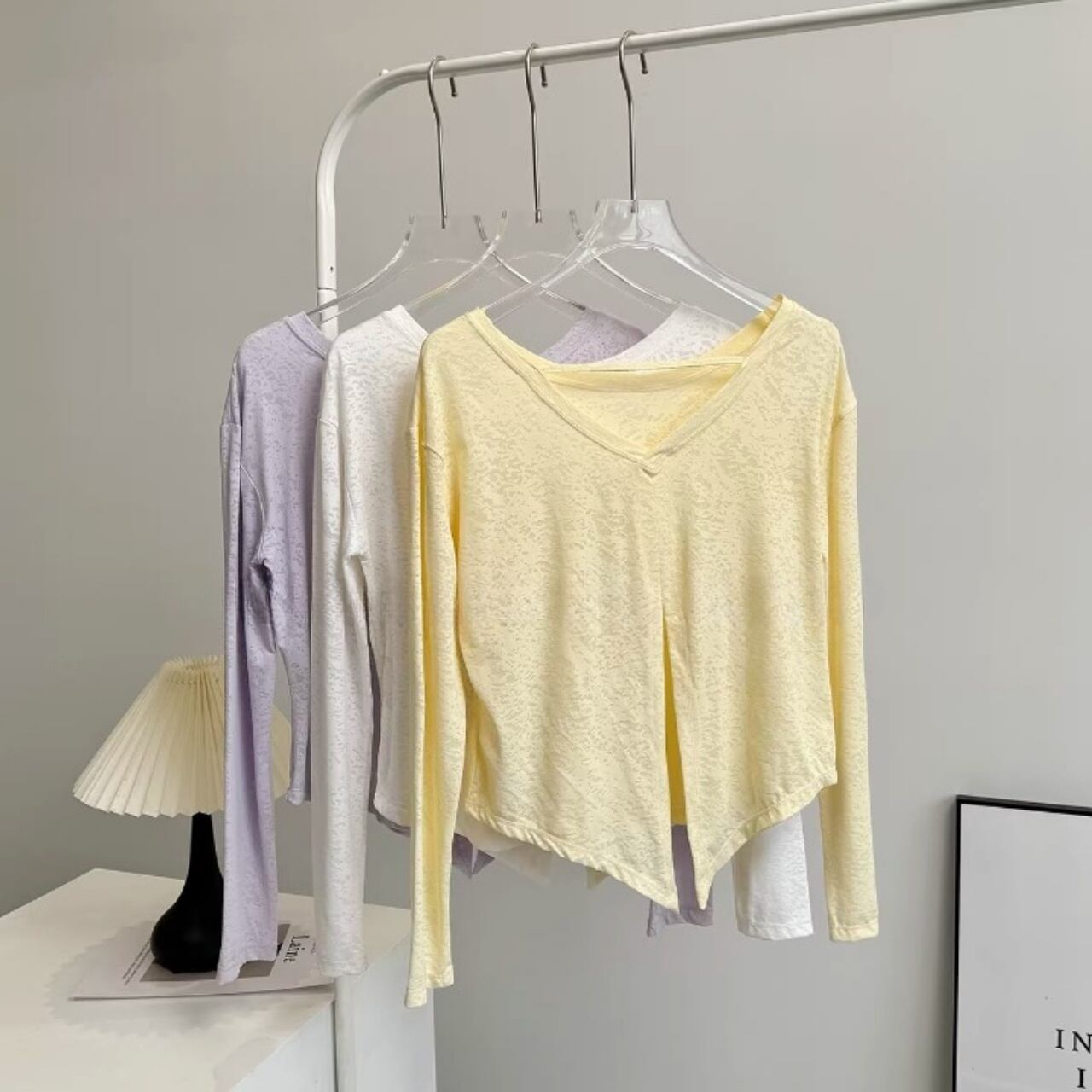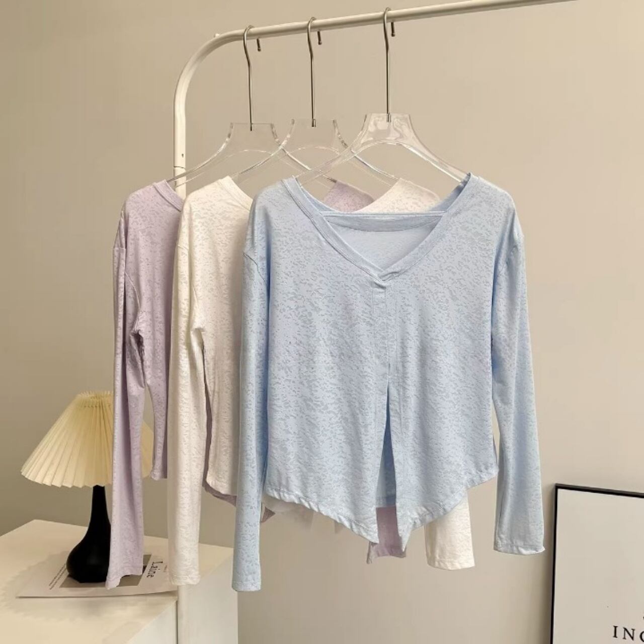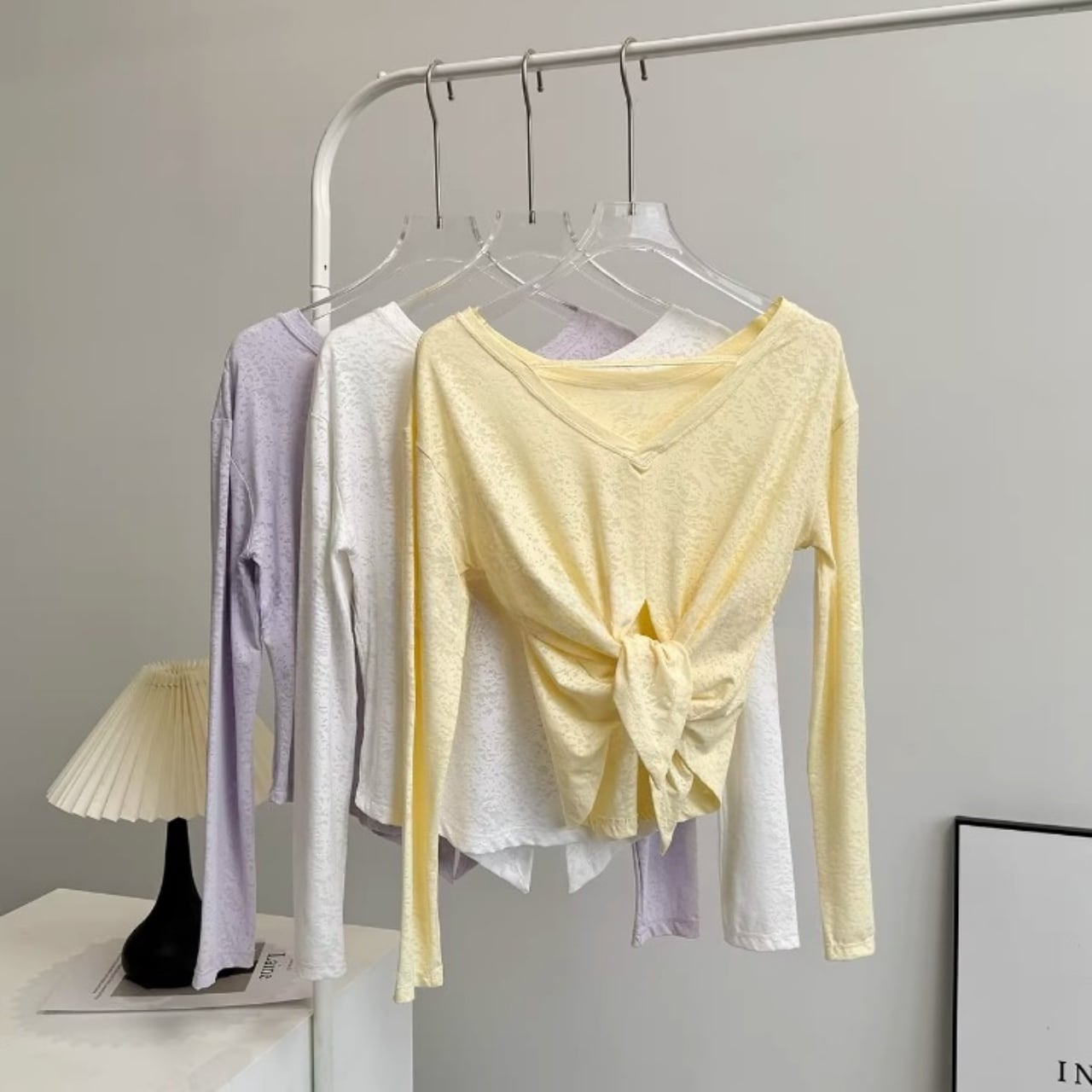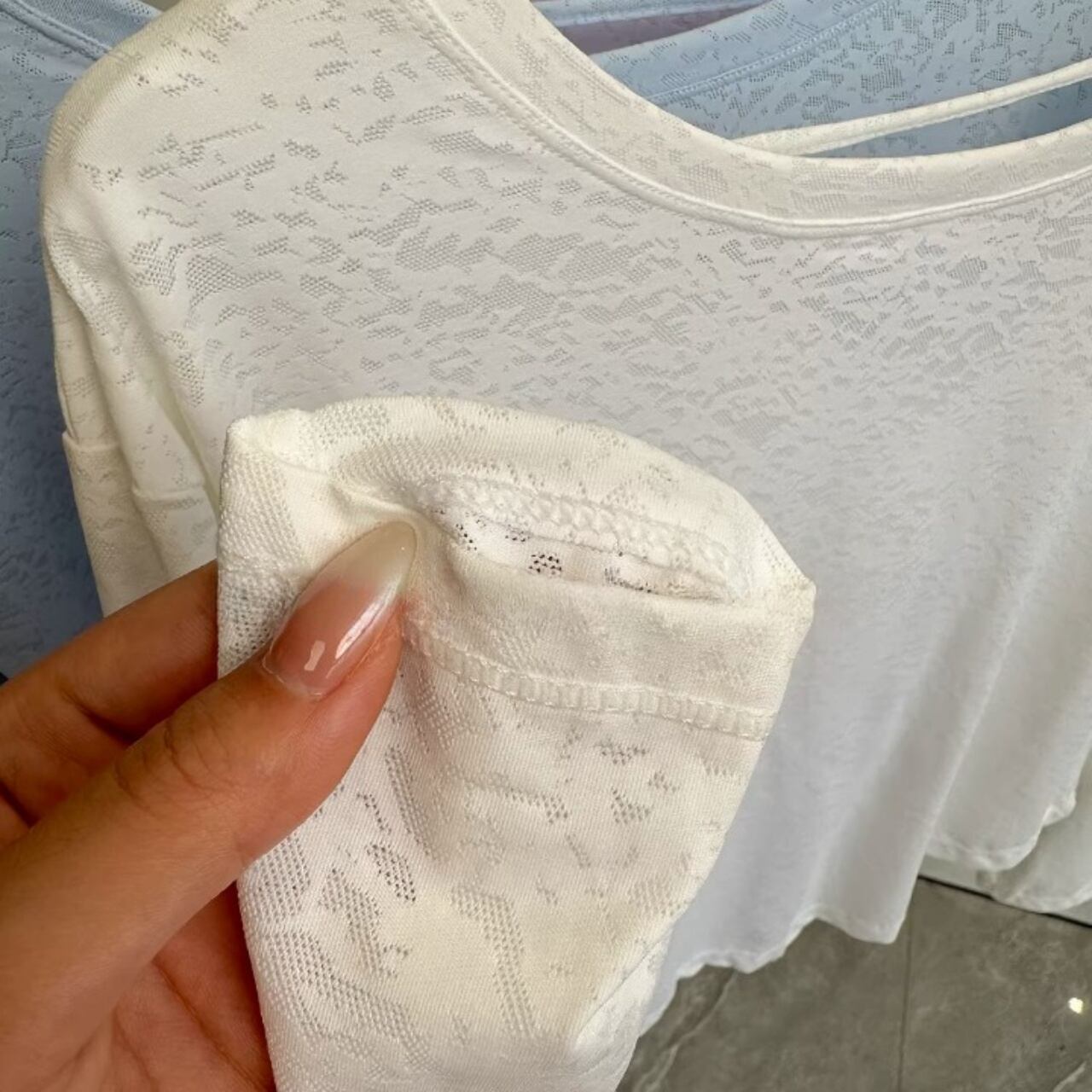 うっすら透けるレース調の表情が女性らしさを引き立てるトップス。