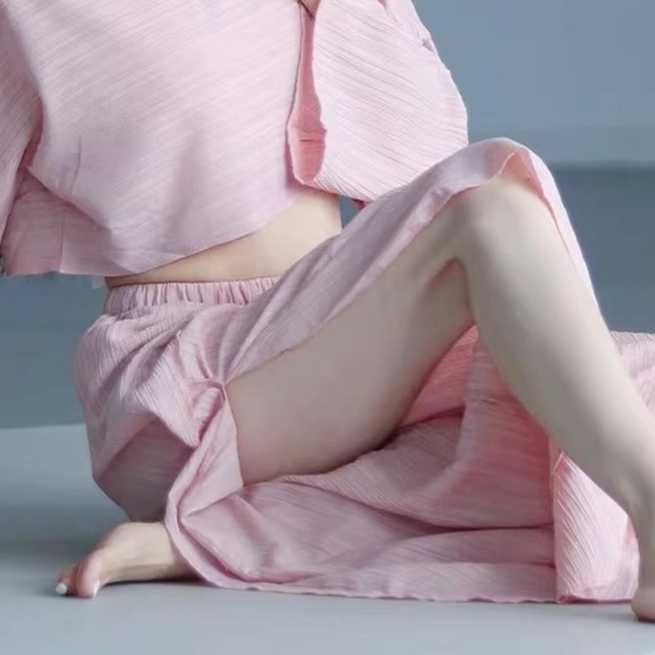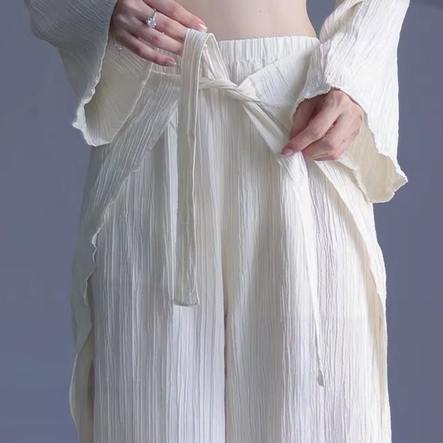 軽やかに広がるシフォンのようなプリーツ素材に、深めスリットとウエストリボンをプラス。