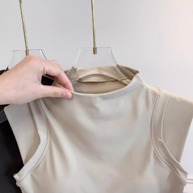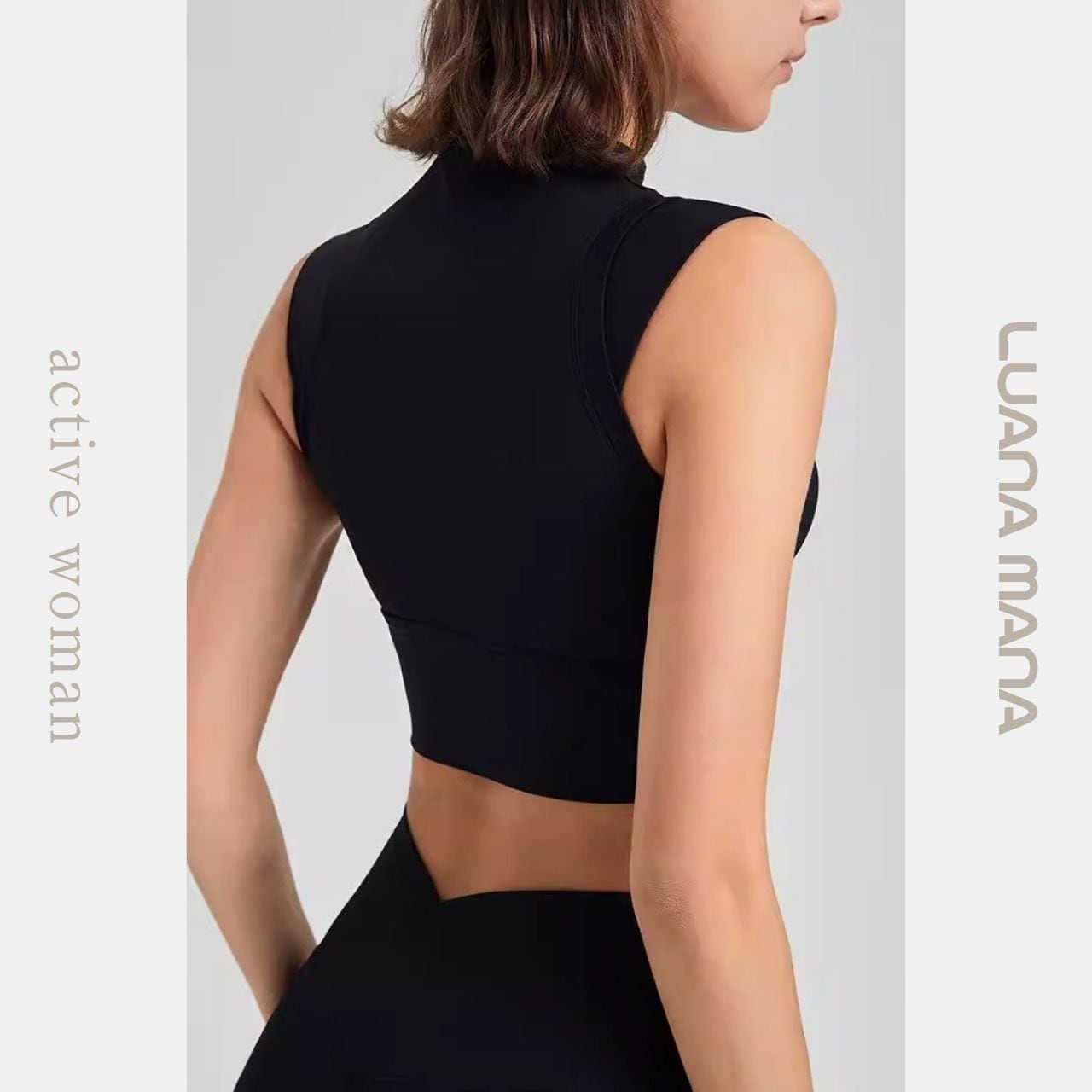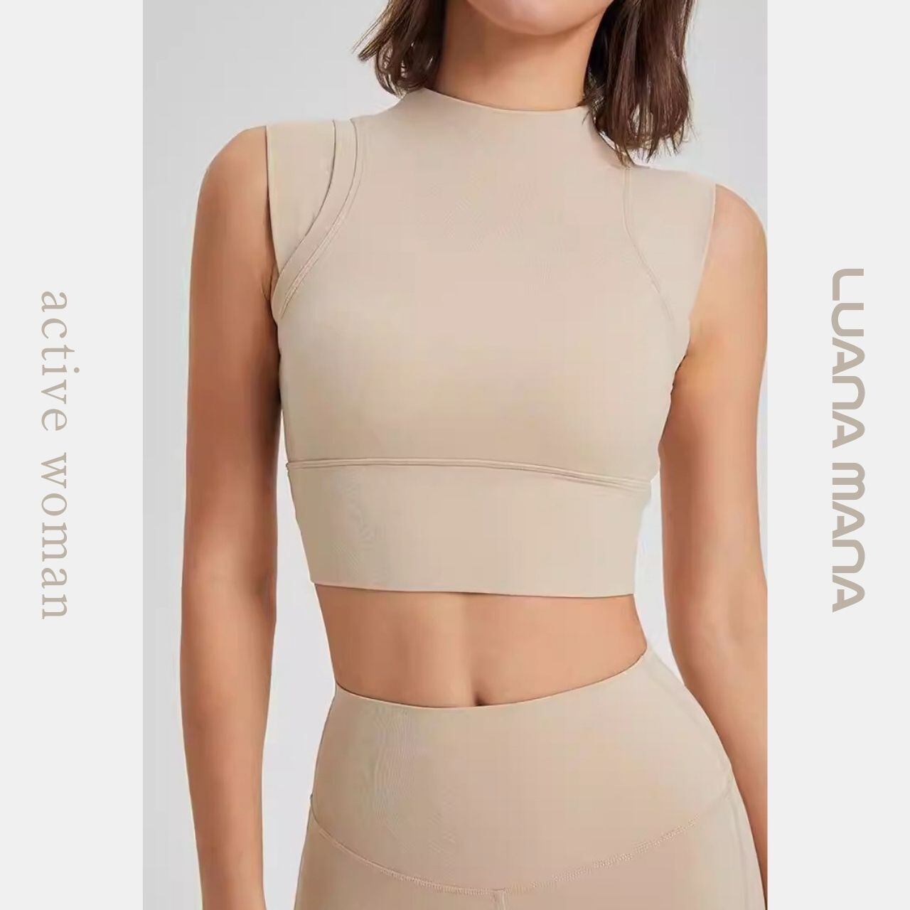 胸元をすっきり見せるハイネックデザインが、品よく大人の印象を与えるアクティブトップ。