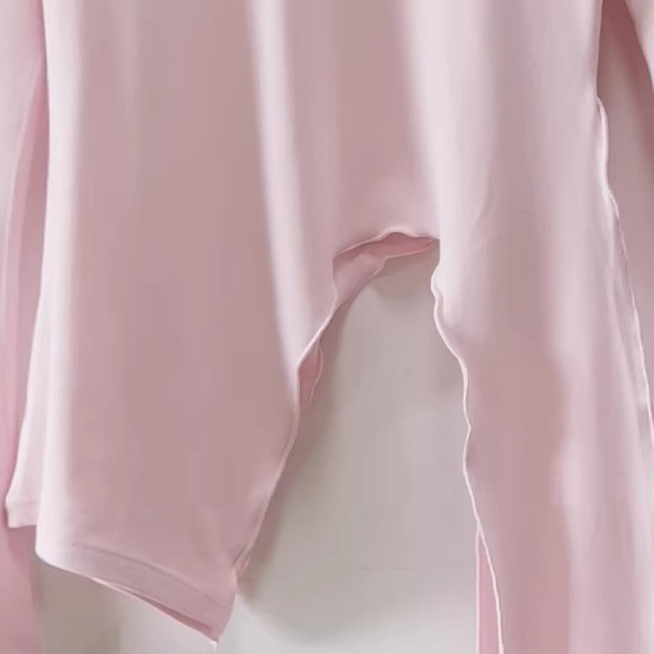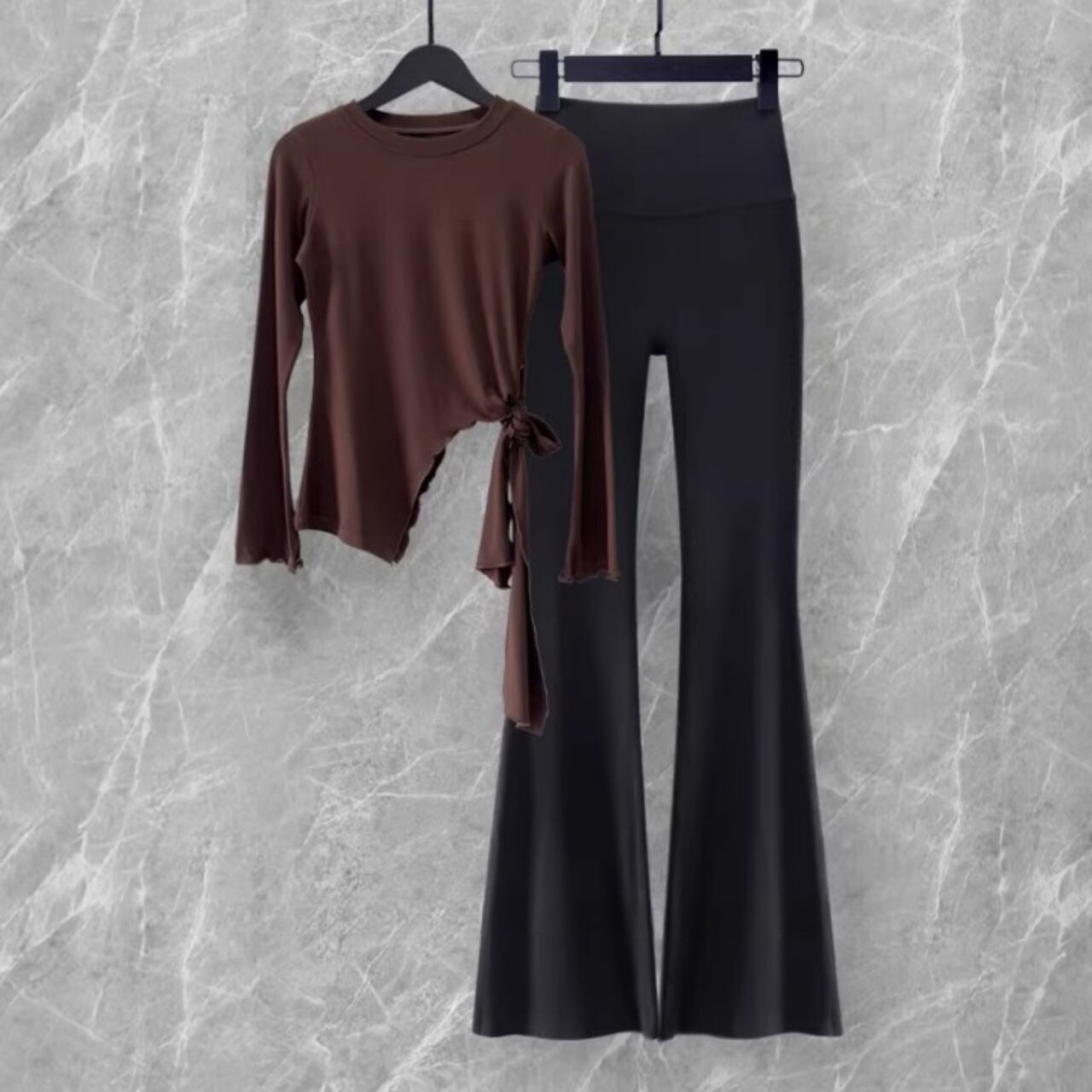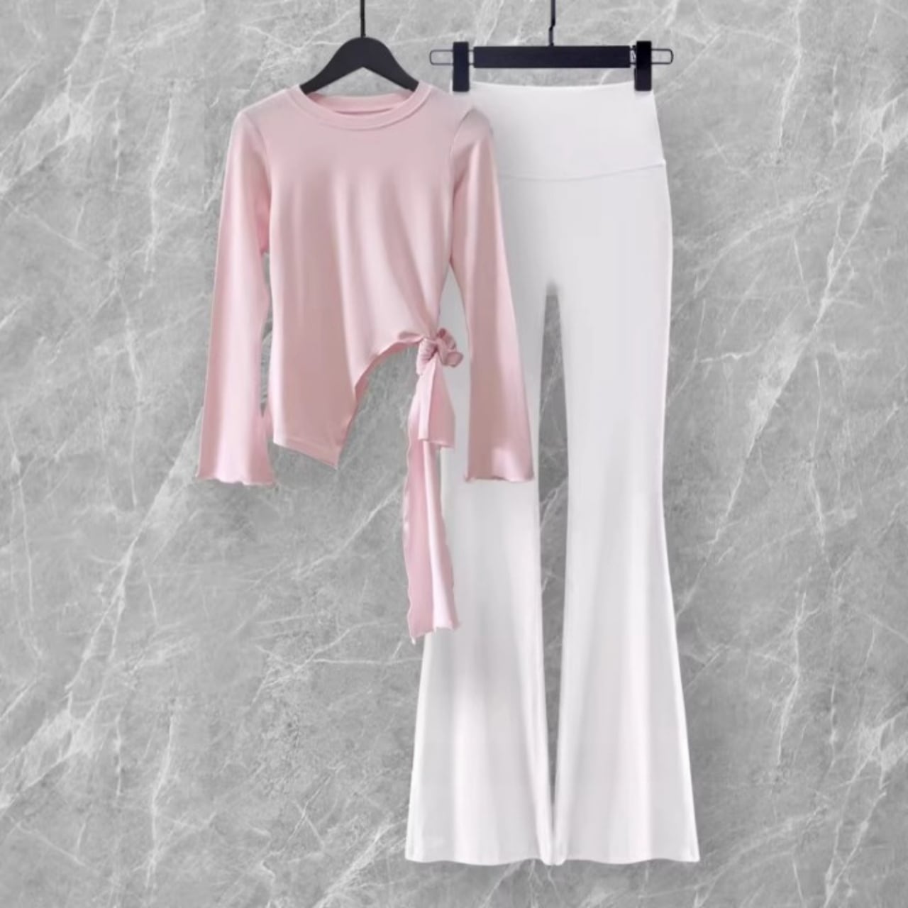 柔らかなピンクトップと、美脚フレアパンツの洗練セット。